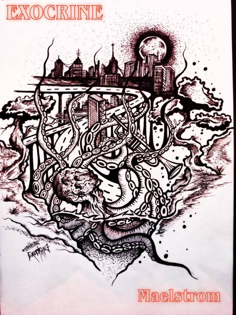 La impresión en la primera escucha de «Maelstrom» fue buenísima pero ganó posiciones el «Cerecloth» de Naglfar para el estreno de reseña ilustrada (gracias una vez más vez Kike por tu apoyo e impulso a la idea, ndr) de la mano de mi hermano Fanone. Hermano de armas, otro obseso, del que me separa una grieta musical llamada deathcore al que Kike llamaría, como su último REA, las delgadas líneas que trocean el death metal. Él más de mas de grupos como Thy Art is Murder o Enterprise Earth, yo más de OSDM y BDM, echo el freno en el siguiente paso a Obscura, Abnormality o los todopoderosos Wormed, encontrandonos en la intersección del death técnico progresivo donde habitan Allegaeon, Inferi, los putos locos de Flub y por supuesto Exocrine, cuyo último trabajo escuchábamos al mismo tiempo en lugares distintos, el artista y un servidor, ¿casualidad?.
