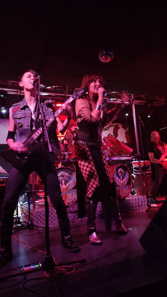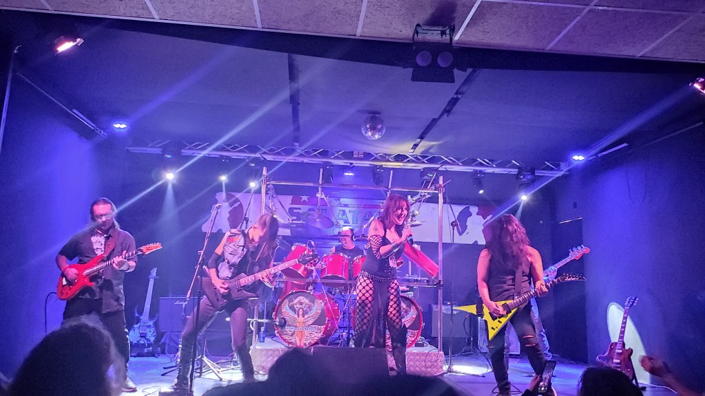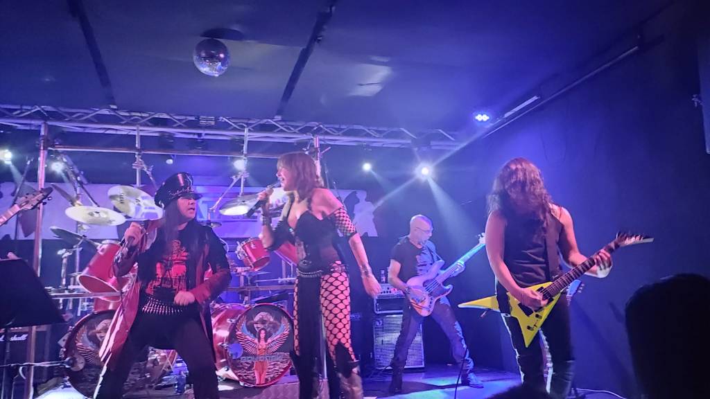 Pero Alea jacta est, como decía Julio César al traspasar el Rubicon con sus tropas. ANUNNAKI aparecía en el escenario con una intro de estilo oriental, para dar paso al tema homónimo del disco y que sirvió, hace un año para presentar a la banda al panorama nacional. Bastante buen sonido aunque un poco saturado en las guitarras, al contar para esta ocasión con tres hachas como eran: David Ignazio que quedaba a la parte izquierda del escenario, Sergi Balaguer más a la parte central y Misael Riojas a la derecha. Los tres iban alternando tanto en guitarras solistas como en rítmicas, esto producia un pequeño descontrol, porque a veces se perdian algunos detalles que desde la mesa de sonido se intentaba solucionar constantemente. Pero en lineas generales sin que desluciera la actuación de ningún componente de la banda. Paco Robles al bajo, quedaba rezagado a la parte trasera como un Ian Hill en Judas Priest, pero con un sonido perfecto y que se dejó notar durante toda la actuación. Pascual Balaguer a la batería como si un Nicko McBrian fuera, quedaba escondido tras un impactante set de batería, sonando muy seguro y compacto, con una gran compenetración con Paco, quedando claro que ya habían sido compañeros en anteriores bandas. Y quedaba como gran protagonista Sonia Gómez, que siempre risueña y con una gran comunicación con el público presente, iba dejando no solo grandes detalles como lo gran cantante que es, si no que a la vez, se comporta como una gran frontwoman, estando muy activa durante toda la noche.