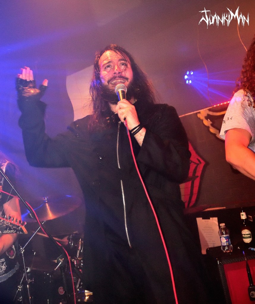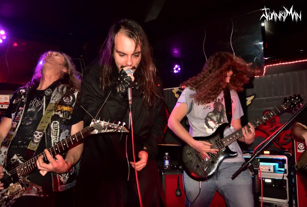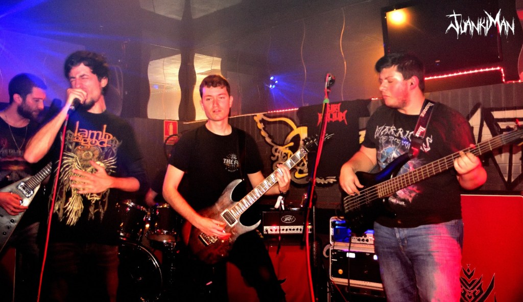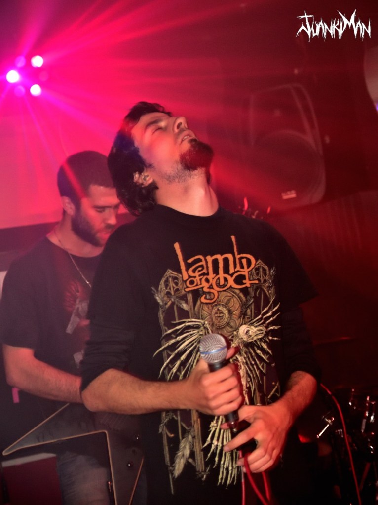 Llega uno de los momentos álgidos y que todos esperamos. Es Holycaust, temazo y momento en que Manu (front) saca el libro flambeado. Espectacular momento de mostrar el artesanal esfuerzo de la banda por dar ese un poco más y que en el escenario queda como si Spielberg hubiera pasado por aquí, y no, en el Barrio de San Blas de Madrid, estos chavales se lo montan con sus medios y una fértil imaginación. Ved las fotos, que no le hacen justicia (lo siento, es por lo de tener dos manos izquierdas para usar la cámara) no digo más… Esto no para y ya suena Dusk inmenso tema con cambios de registros que te agarra por la pechera y no te suelta hasta que concluye. Completo, brutal y maduro en forma y fondo. Uno de mis favoritos, sin duda. Hay que dar visibilidad a The Idiotic Principle, porque es el último trabajo y porque es bueno. Llega el turno de Not My Cross y The Puppeteer. Sonidos clásicos y sólidos para el primer tema y más acelerado y con cambios de ritmo y patrones el segundo que mantienen la atención en la banda y en su propuesta, porque suenan de lujo.