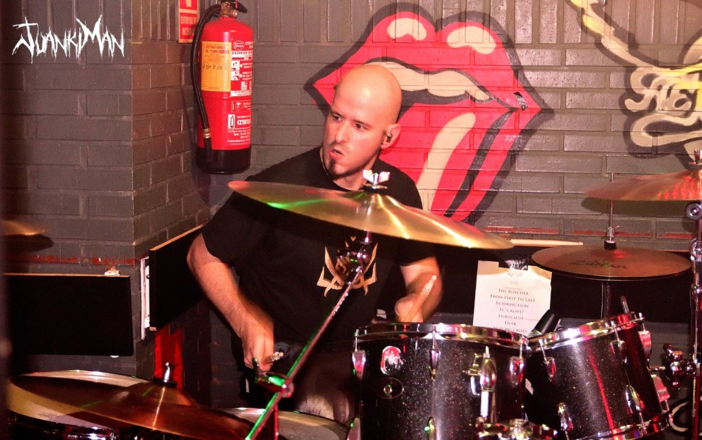 Tras el cambio de trastos en el escenario, era el momento de que subiese Mordhida para, como siempre, darlo todo. Antes, un ratito de Tetris y es que no era nada fácil situarse en aquel escenario. Yo mismo pasé las de caín cuando subí a tirar la “foto finish”. casi desmonto la batería de Carnacki “Manuel Martinez” y a poco hay que llamar a los bomberos para que me rescaten de entre los parches y platos (pasa por subirse con
