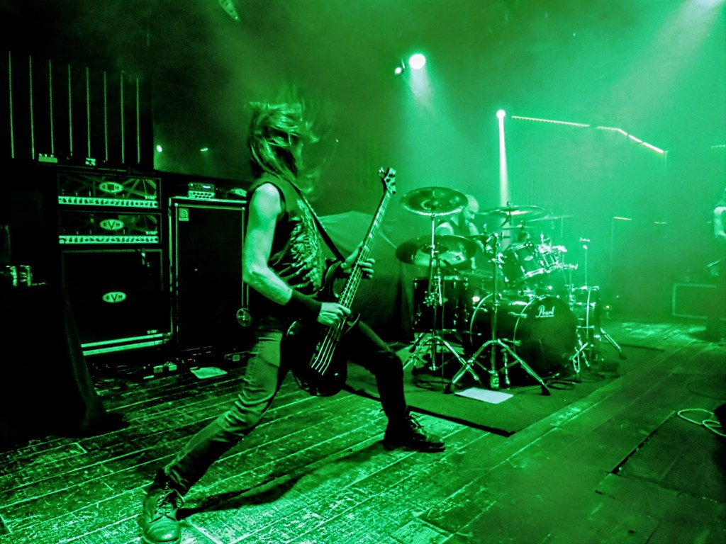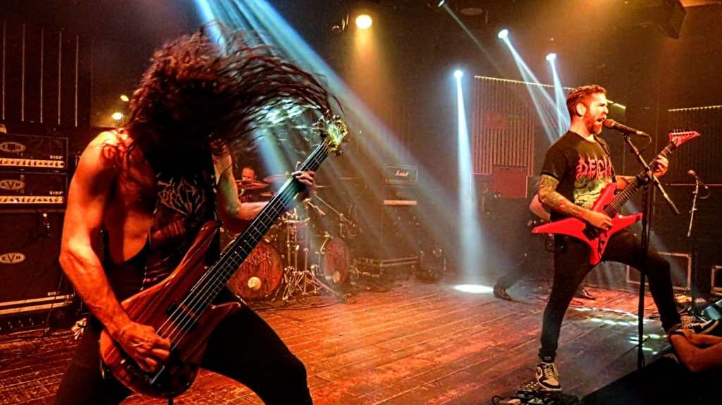 Soy malísimo para esto, pero calculo que en torno a 250 esperábamos con ansia que diesen las 21:45, momento en que Davidson, Bamberger y Pearson, apoyados en esta ocasión por Noah Young, saltaban a escena y abrían sus birras y sus aguas con «O Fortuna» como antesala del arranque espectacular con «Nihilistic Violence». Y es que cuando consigues llevarte a la peña al bolsillo en el primer tema, la cosa se antoja antológica. Tercera visita de REVOCATION y tercera demostración de maestria y de técnica mayúscula. Gozaron de un sonido espectacular y una retroalimentación mágica entre ellos mismos y con el público. El aura de mago de las 7 cuerdas de Davidson alcanzó niveles Schuldinerescos produciendo caídas de baba, roturas de cuello y fracturas de dedos haciendo airguitars a la peña. Bamberger imprimiendo fuerza en alianza perfecta con Pearson y hasta el foráneo Noah tanto en rítmica como en el apoyo vocal brillaban mientras Davidson bailoteaba provocando una tormenta de riffs y solos incontrolables.