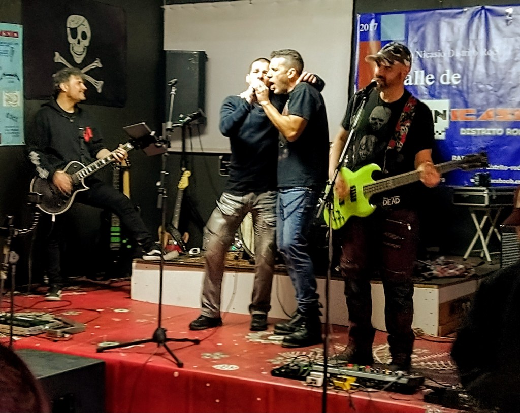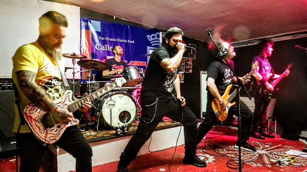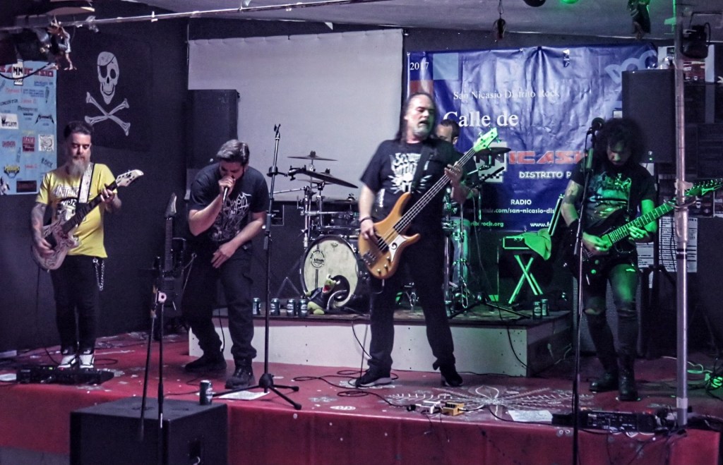 Lo cierto es que el acceso al recinto donde se ubica la nueva «sala» San Nicasio no es el mejor, además de nada apetecible sobre el mapa si no conoces la zona, pero la realidad es muy diferente, sobre todo en un horario vermuth como el que acontecía. El lugar está cuidadísimo, es espacioso, la sala es diáfana y con buen equipo de sonido, además de la gran hospitalidad marca de la casa en cuanto a buen rollo, comercio y bebercio a precios populares. Que más se puede pedir…Por todos estos motivos, el retraso de más de una hora del inicio del evento se llevó sin problemas, sumado a que la banda que abría, llamada Rock’R’Us, se trataba de un conjunto de versiones, que con todo mi respeto, no lo soporto. Hasta que estando fuera, de charla, ya que siempre caemos los mismos por estos saraos, empiezo a escuchar que sonaban de nivel, y es que en esta banda estaban nada más y nada menos que Jorge, batería de Avulsed, David, guitarra de Vita Imana, y Albert, ex-Dark Moor al bajo, acompañados por un vocalista, cuyo nombre no recuerdo, pero conocido del gariteo metalero madrileño, con una pose macarra top. Combinaron clásicos nacionales de SA y Barricada, para los que contaron con un invitado llamado Tony, que me disculpe si pertenece a alguna banda y no le reconocí, con internacionales (Megadeth, Maiden, Motorhead…) acabando con el «One» de Metallica, en el que subió Miguel Báez (Holycide, Caedis) como segundo guitarra. La peña, unos 50, estuvo entretenida y la banda cumplió con creces su función.