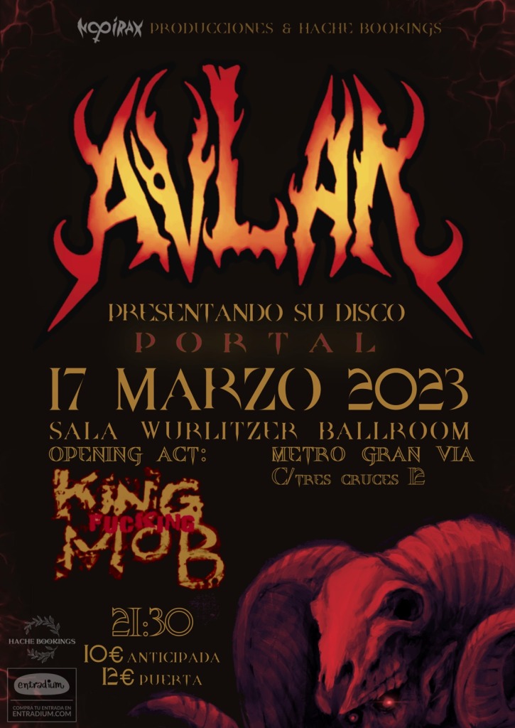 NOOIRAX PRODUCCIONES & HACHE BOOKINGS presentan, el 17 de Marzo de 2023, un concierto único en la Sala Wurlitzer Ballroom, en plena Gran Vía de Madrid. Una noche en la que la banda Avlak tocará en directo su último lanzamiento “Portal”, acompañados por los eclécticos sonidos de King Fucking Mob.