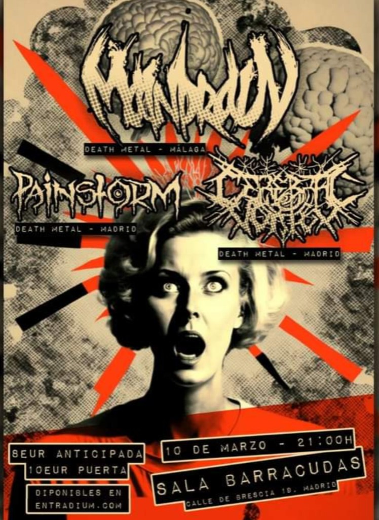 Pensando en mi cumpleaños (el 11 de marzo), busqué eventos cañeros para celebrar mi merecida vuelta al Sol ese fin de semana y suerte que, concretamente la noche del 10 de marzo, se concentraban en la sala Barracudas MAINBRAIN (Málaga), PAINSTORM (Madrid) y CEREBRAL VORTEX (Madrid), tres grupos death-metaleros que prometían prepararme una fiesta pre-cumpleañera con trallazo del bueno.