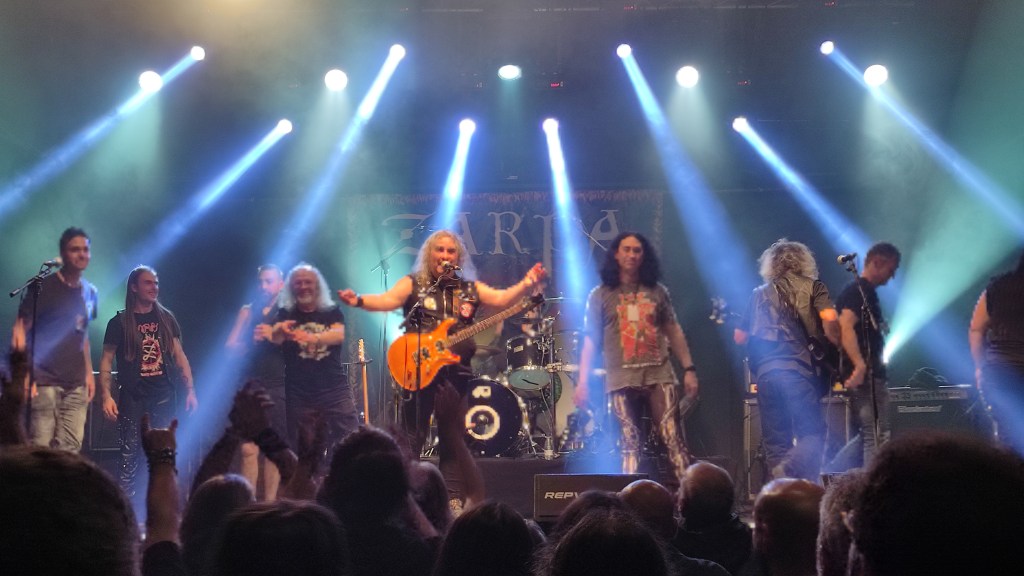 Como siempre, Vicente Feijoó comandaba su cuadrilla con paso firme. El escudero fiel Vicente Romero «Hueso» al bajo, Marcos Sanz a la guitarra rítmica y Miquel Alejandro en los parches mantienen la máquina bien engrasada para que estos referentes del heavy metal nacional continúen haciendo bolazos de escándalo. «Máquinas» era la encargada de abrir una gran noche que Badana ya había dejado a punto de caramelo. No es el tema para mi gusto personal indicado para iniciar un concierto y más, con el repertorio tan extenso que tiene Zarpa, pero tiene suficiente calidad para que eso no te parezca un problema y es que inmediatamente suena «Babilonia la ramera» que, aunque continua la senda más Hardrockera de Feijoó y cia. es tan cojonuda que ya estás absorto en el mundo que ha creado la banda.