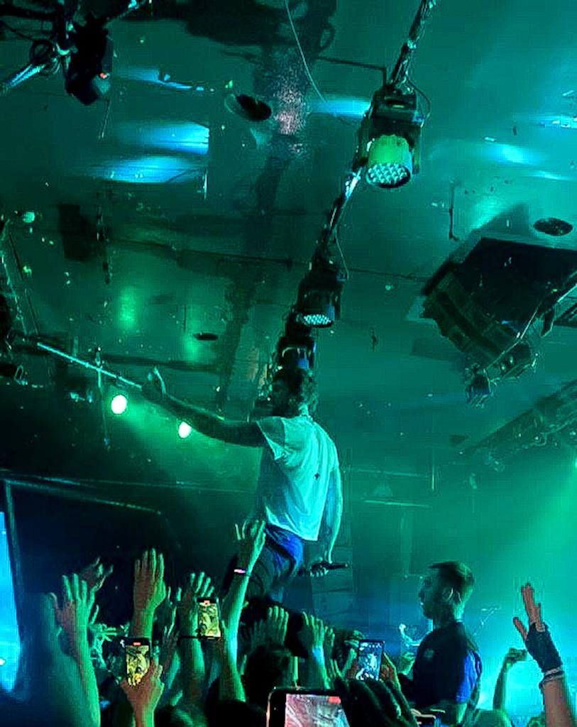 La Riviera, o lo que es lo mismo, esa sala tipo «moneda al aire» en lo sonoro, que monopoliza la oferta capitalina por capacidad, y que en las últimas ocasiones había decepcionado, presentaba un aspecto formidable desde primera hora. Plagada de gente jovenzuela, o al menos más que yo jeje, y con caras de querer disfrutar al máximo calentando cual corredor sanferminero antes del chupinazo, mientras se componía con naturalidad, la que iba a ser la pista de los brutales bailes a los que nos tiene acostumbrado el colectivo coreta madrileño, bajo la atenta mirada del personaje anime en la proyección de vídeo y los acordes del putísimo rey trapero floridiano GHOSTMANE.