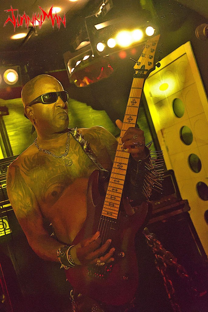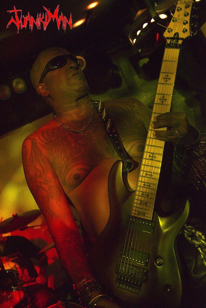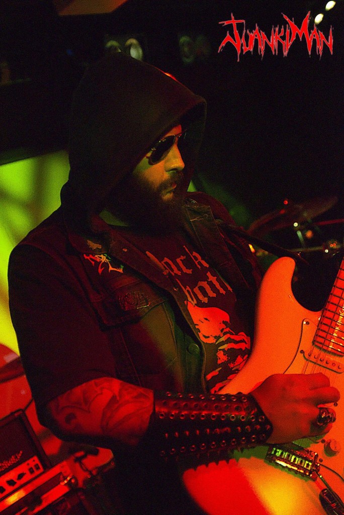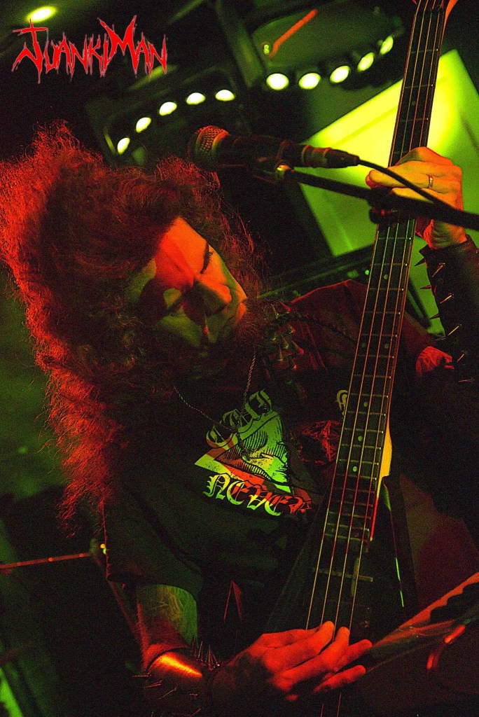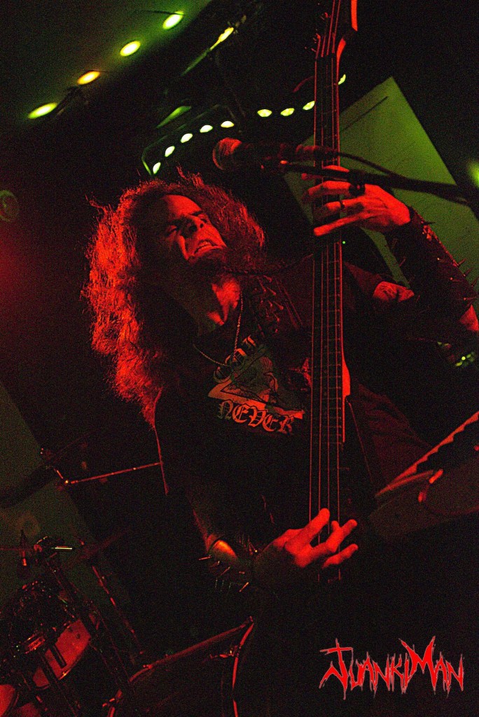 La poderosa batería de Betto Apophis, que con maestría llevaba el ritmo haciendo temblar el suelo y nuestras cabezas. Diego Araújo, el hombre orquesta, cargado con su bajo flying, un minúsculo teclado y una desgarrada voz que acompañaba de una expresión impagable; rostros crispados, ojos en blanco; gritos y gruñidos furiosos; manos que rasgaban el aire dando más fuerza si cabe a la interpretación; implicación total, inmersión absoluta en lo que estaba taladrando nuestras cabezas. Una guitarra Fender Stratocaster blanca, con ese blanco viejuno que tanto llama la atención a los buenos degustadores de clásicos de las 6 cuerdas, en las manos de Adriano Caverna, lograba arrancar con sus dedos, unos sonidos ahora oscuros y descomunales, ahora agudos y punzantes, con unos desarrollos en los solos apasionantes, rápidos, a tiempo y exactos en momento y lugar ¡me erizaban los pelos de la barba! (que es dónde más hay, claro), seguidos por unas fases rítmicas que asentaban ese sonido grave siniestro y poderoso que nunca se salía de su justo punto y que me alisó la chiva durante todo el concierto, al tiempo que Armando Silva, auténtico totem magnífico de Mystifier y provisto de una Schecter de 7 cuerdas, modelo por el que yo tengo una especial filia, daba la réplica a las 6 cuerdas de Adriano.