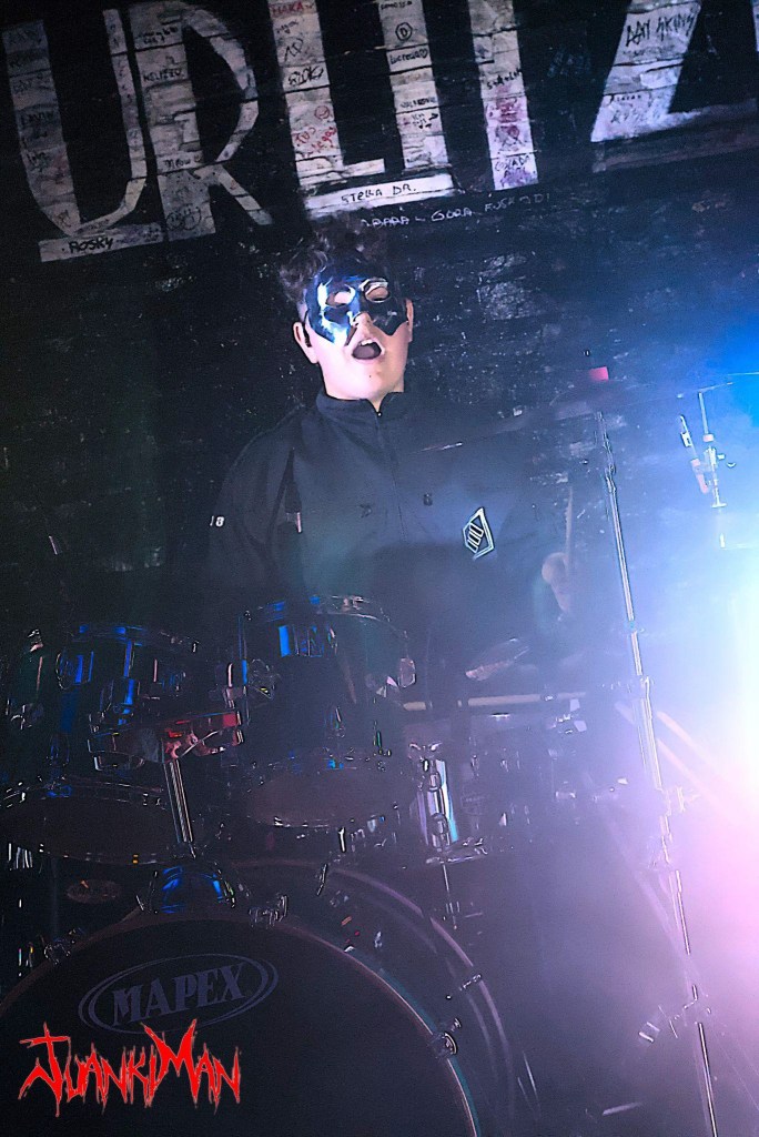 Desgranaron así sus 7 primeros temas que no detallo porque sinceramente fueron una locura de luces, oscuridad, Metal, pogos, en los que de nuevo, Manu, ex-vocalista de Unrecht, casualmente siempre se veía implicado y es que es puro nervio. Cualquier día se cruza consigo mismo en un pasillo. El público disfrutaba sin saber a qué atender más si a las pompas de jabón a los ir y venir de Carlos por el escenario, a los acordes y solos de Guille, a Pablo ese pequeño astro al fondo destrozando la batería con una fuerza y destreza impropia de la mayoría de los baterías adultos y al que se le adivinaba a pesar de ocultar su cara, una sonrisa de felicidad por estar haciendo lo que más le gusta, a Erik, que ahora estaba rasgando su bajo en el escenario, como ahora se mezclaba con el público en medio de un pogo o bien se subía a la barra de la Wurlitzer y la recorría mientras no perdía el ritmo frenético que los Unrecht imprimen a sus temas.