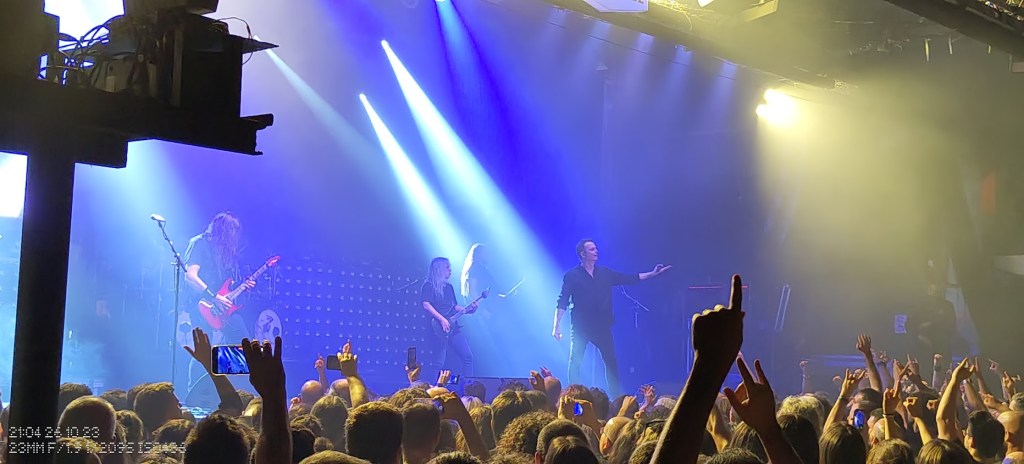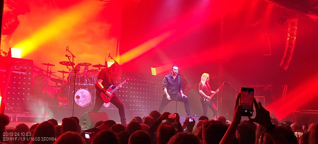 Ya con dos temas, se habían metido al publico en el bolsillo y la conexión entre ambos fue esplendida. Todo el mundo coreando las canciones, y la banda encima del escenario con unas sonrisas que evidenciaban que estaban disfrutando mucho. Tocaron «Nightall» que no puede faltar wn sus conciertos, sorpresa con «Script for my réquiem» (no la esperaba) y segunda visita a su flamante The God Machine, con el tema «Violent Shadows» (previsible dado que fue el primer single que lanzaron antes del disco en plena pandemia). Otra sorpresa, «Skalds and Shadows» del disco A twist in the myth, balada al estilo de corte medieval y que tanta calidad tienen, con las 2 guitarras acústicas y que sonó a gloria bendita. Creo recordar que Hansi nos vacilo con el tema de las acústicas y las baladas y a mas de uno se pensó que se venia el momento de «The Bard song» pero no, grata sorpresa el recuperar este gran tema.