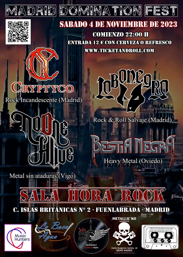 ¡Primera edición del Madrid Domination Fest!. Iniciativa de Kamikaze Sonoro, La Boca Agua by Cocinerarockera y Paloma Zar Vit management, cuenta con el patrocinio de Music Hunters y Metallic’ko. Participan Bestia Negra, No One Alive, Cryptyco y Lobonegro, y se desarrolla en la sala Hora Rock de Fuenlabrada el día 4-11-2023 a partir de las 22:00 h.