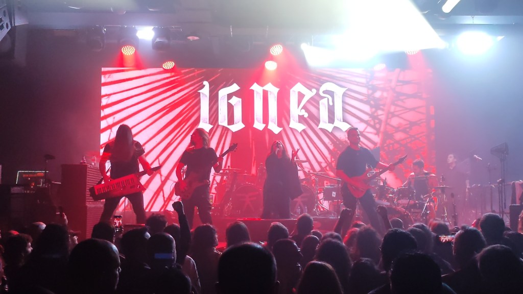 Ignea, banda ucraniana de metal melódico, ofreció antes un ritual con un sabor totalmente diferente, mucho más intimo y melódico, con muchos elementos nórdicos y paganos, combinados con unos intensos riffs de guitarra, partes electrónicas y ambientales, y con una mezcla de voces guturales y melódicas a cargo de la excelente frontman que es Helle Bohdanova. Pocas luces en el escenario para una perfomance sensual y atronadora a partes iguales, un discurso muy medido y de una ejecución muy trabajada, 10 años ya desde que esta banda apareciera en la escena de metal más melódico, que ha conseguido labrarse un cierto números de seguidores que coreaban entusiasmados en las primeras filas del concierto. Su repertorio se basó sobre todo en su último disco, “Dreams of Lands Unseen”, un trabajo delicado y profundo, oscuro y enérgico, mucho más rico en matices, del cual sobresalen sobre todo las increíbles alternancias entre las voces guturales y melódicas de Helle, como en el tema “Camera Obscura”. Una banda a seguir, no cabe duda, que convenció bastante al público congregado.
