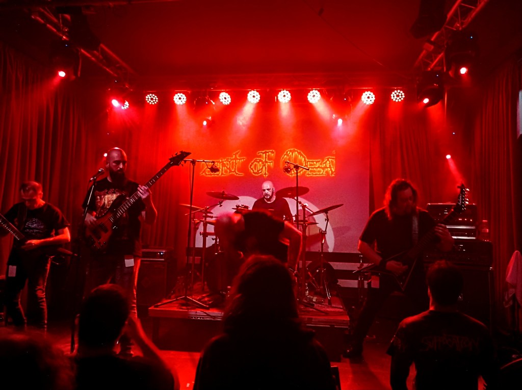 Scent of Death fueron Chupitada Padre. Fueron puto lío. No solo eso, se doctoraron cum laude en la Sala Máster. «Esta va de prueba» dijeron antes de empezar. Carallo con la de prueba. Menudo aperitivo. El concierto fue pura crema. El cantante, Marcos, que igual no lleva ni un año con Scent, es una bestia. Rolando, su batería de Lisboa, un animal. Solo los que estábamos delante nos dimos cuenta de que se le fue a tomar por culo una baqueta en “Sooner or Later”, pero no fue mayor problema para él. Luis, al bajo, otro que tiene presencia, con el micro inclinado al más puro estilo Lemmy, para hacer el acompañamiento de voz. Bernardo y Jorge, soberbios a las seis cuerdas.