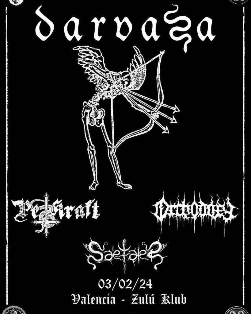 En cada ciudad, esta entidad estará acompañada por distintas cohortes infernales haciendo de cada directo una experiencia única. Darvaza y Sætaıǝr estarán presentes en las 3 fechas junto con los siguientes en cada ciudad: Spectrum Mortis el 1 de Febrero en la sala Silikona en Madrid. Arkhaeth (Tarragona) el 2 de Febrero en la sala Wolf de Barcelona. Y Pestkraft y Orthodoxy en el Zulú Klub el 3 de Febrero en su Valencia natal.