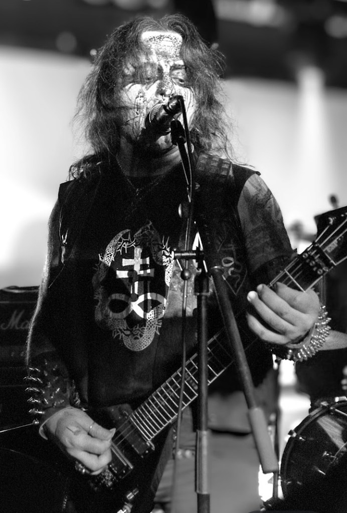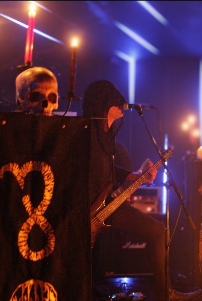 Los siguientes en este triunvirato de fuerzas oscuras eran Spectrum Mortis. Una banda con un buen grado de veteranía en estas lindes. Hasta el punto de congregar a bastante más gente que Sætaıǝr. Llenándose fácilmente tres cuartas partes del aforo de la Silikona. Había bastantes con todo que se lo tomaron con cierta calma a la hora de entrar pero, dado mi caso y contando humildades personales, era la primera vez que los veía en vivo. Y con todo y con eso tenía un deber pendiente para con vosotros, haciéndome eco de todo lo mas detalladamente posible. Por lo que no perdí ni un segundo en cuanto el olor del incienso y las velas comenzó a anunciar el primer oratorio del ritual oscuro que iba a presenciar. Y es que Spectrum Mortis no escatimó a la hora de hacer gala de su propia presencia. Grandes candelabros de pie iluminados y un gran altar presente frente al escenario (que no dentro de el, cosa curiosa ya que tampoco hubo excesivo movimiento que hiciera peligrar su integridad dentro del mismo) presidian la puesta en escena de Sheram, Aath, Aataa y Ta’ao. Quienes aparecieron ataviados con túnicas negras que dejaban ver lo justo de las entidades encargadas de tan oscuras y contundentes artes. Fueron desgranando tema por tema un set realmente potente. Cayendo temas tanto de su ultimo LP, “Bit Miseri
