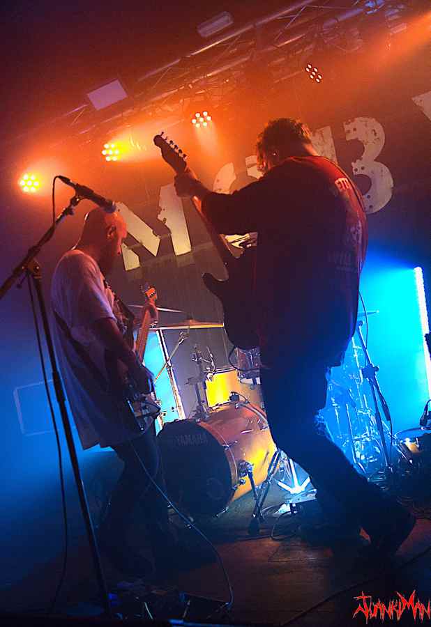 A la carrera entraba en la sala tras la rutinaria gestión del acceso. No me habían esperado y NOVIEMBRE, ya aporreaba los parches, gritaba desaforadamente y hacían tronar las cuerdas de sus instrumentos. La sala lucía fantásticamente vestida de público, joven en su mayoría que no perdían vista ni orejas de lo que se desarrollaba sobre las tablas. Nubes de humo impedían ver con claridad a la banda, pero ya dicen que por el sonido se sabe dónde está el escenario ¿o no era así? Da igual. “Cámara en muñeca” me dispuse a recuperar el tiempo perdido.