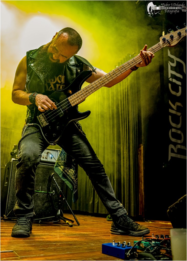 Tras los saludos a los congregados con alguna felicitación de cumpleaños escondida por entre el publico y persona conocida por la banda, el show pedía más madera, y a ello continuaron los valencianos, recordándonos con “Sicario” el buen hacer de sus anteriores trabajos, sonando de maravilla la sección rítmica de Tomás Martínez en el mástil de cuatro cuerdas e Iñaki Genís a la percusión sin descanso ni tregua.