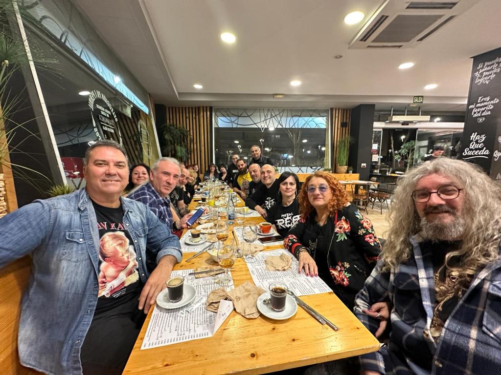 Pero antes, un buen grupo de viejos rockeros quedamos para estar juntos un rato y poder compartir tertulia e ir calentando motores. Fue gratificante volver a encontrarme con gente a la que tengo muy pocas oportunidades de ver, gente que siempre están presentes en la vida de REA. Entre ellos Juan Antonio Fabián y Pedro Delgado que hace un tiempo perpetraban entre los dos el programa Cuerdas de Acero, y que nos ayudan en algunas cositas tanto para el podcast como para la web. También estaba la gente de Rock en Lata, Metal Bats y algún amigo más. Curioso que en este concierto trajeramos a nuestras mujeres para que vieran lo que era una reunión de viejos rockeros. Y a pesar de sus reticencias, terminaron pasando pasándolo bien y también pasando de nosotros… más fuera de la sala que dentro.