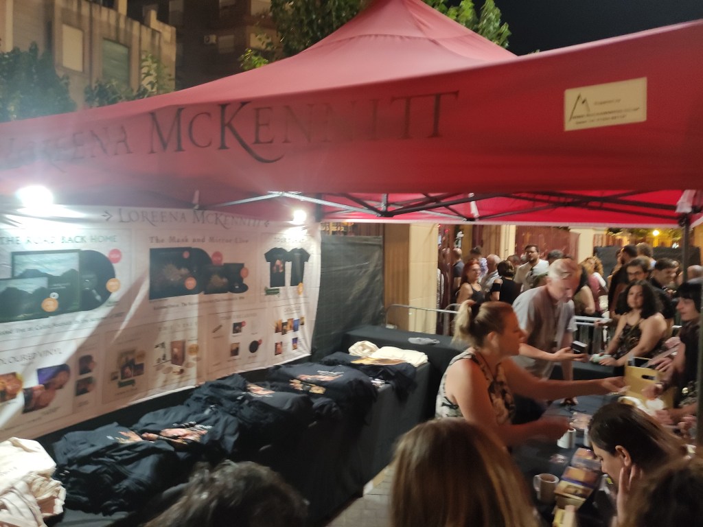 Lentamente salimos del recinto donde un solitario puesto de merchadising lleno de gente, vendía el material que Loreena McKennitt tiene a disposición por medio de su sello independiente Quinland Road, siendo ella la que maneja sus tiempos a la hora de componer y sacar su música. Sí cuenta luego con el poder de Universal music en su distribución mundial. Curioso que trabaje de la misma forma con su productora y agencia a la hora de preparar giras y conciertos, hecho que le facilita su comodidad y el de sus músicos la elección de los lugares donde va a tocar y así se acopla a sus condiciones musicales para crear esa magia entre público y escenario, de ahí que tenga en su currículum lugares mágicos donde ha tocado del nivel de la Alhambra de Granada, Teatros Griegos y Romanos o Castillos ingleses y Franceses. Volviendo a la comparación con el Rock, las camisetas se vendían a un precio de 30€, considero un precio bastante alto a pesar de ser inferior a muchos grupos de nuestro estilo, y los CDs oscilando entre los 15€ y los 40 o 50€ en ediciones limitadas muy especiales. Todo hay que decirlo, muy bien editadas y completas de material.