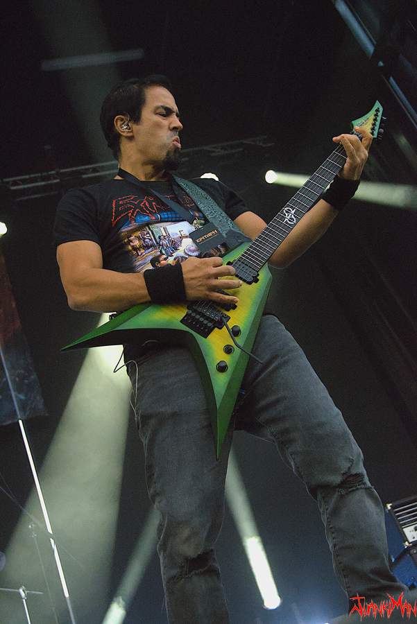 Llegó el turno de los madrileños HOLYCIDE ¡Y con ellos llegó la locura! con un Dave Rotten que no paró quieto un sólo segundo. Contaron con la inestimable colaboración de David Ramos, actual miembro de VITA IMANA, a los mandos de una LTD de un blanco inmaculado, que tuvo que ponerse al día en dos patadas y que resolvió con una nota excepcional el reto. Fue una patada en los bajos que reactivó a todo el mundo. Vicente, Santi, Ancor, Salva no dieron tregua y con la noche ya soplando sobre nuestras nucas su aliento fresco y agradable, porque hasta el momento el calor era espectacular, comenzó el desgrane de los temas de su más reciente trabajo. El todavía caliente “Towards Idiocracy”.