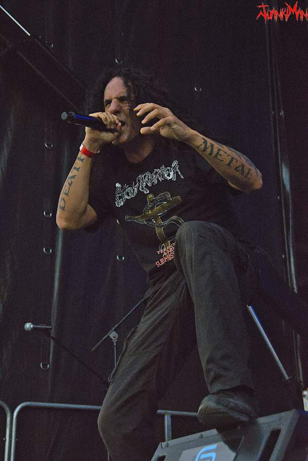 Dave Rotten, en un más o menos ágil movimiento se pasó el foso por sus “fosas” y encaramado a la valla saltó/fue abducido, como prefiráis por el público que lo llevó en volandas, con seguridad tirando de las piernas y el público de las manos. Según el parte de la autoridad competente no hubo de lamentar ningún descoyuntamiento de vocalista de banda de Thrash, con lo que el final fue muuy feliz.