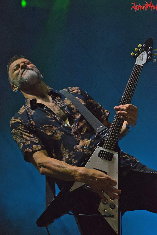 Dicho esto, el espectáculo fue excepcional y creo que decepcionar, no decepcionó a nadie. Cuando iniciaron su show, la noche no es que hubiera tendido un “velo” sobre Cangas sino que una pesada “manta” permitía disfrutar de la iluminación del escenario. A. A. Nemtheanga recorría el escenario deshaciéndose en gestos, posturas, provocaciones al público que atento y sin parpadear asistía y perseguía cada gesto, cada movimiento y es que estamos ante un exquisito “front” que a pesar de los años en la carretera respeta al público lo suficiente como para dejarse la piel y puede que la salud en pos de ofrecer un espectáculo a la altura de PRIMORDIAL. Esas son palabras mayores. Respeto.