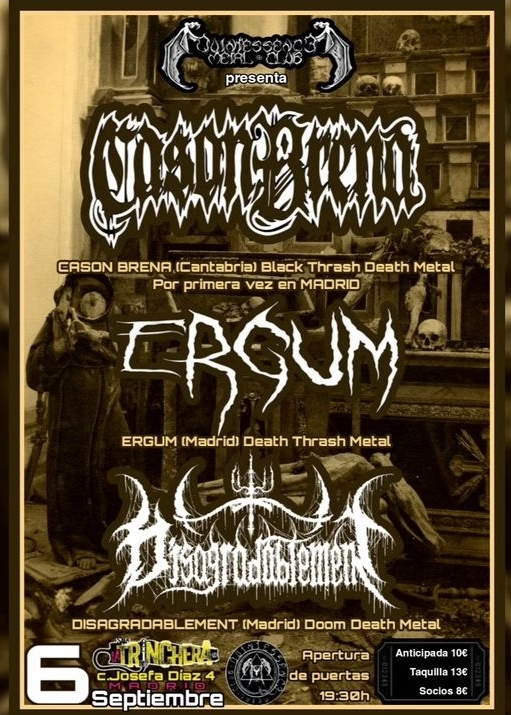 Desde lo mas profundo de los montes de Cantabria, entre lobos y trasgos, Cason Brena se estableció en 2020 tras un pacto firmado entre Chus, dando fuerza a la batería (ex-Dogma), Fer (ex-Dogma) y Riki (Sinpekado) con sus guitarras bien, Cuetu (Infernaculum, Clavicula Salomonis, Lucifuego) recitando voces desde lo mas profundo del inframundo y Álvaro (Triskelion) sellando el bajo. Desde 2022 han llevado su LP Injurias a numerosas tablas, mostrando su potente mezcla entre Death/Thrash, HC y hasta el Grind, por cualquier rincón de la península. Y la receta en el caldero no podría ser mas potente, auténticos hachazos cuyos filos dan fe de haber sido curtidos como solo en tierras norteñas se puede. Una generosa bocanada de brisa cantábrica, tan agradable como lacerante en fechas previas al equinoccio de otoño. Con motivo de su estreno en Madrid el 6 de Septiembre en la Trinchera (Vallekas, Madrid), de la mano de nuestros hermanos de QMC, no dudamos en charlar un rato con ellos, para que nos informen de la actualidad de la banda.