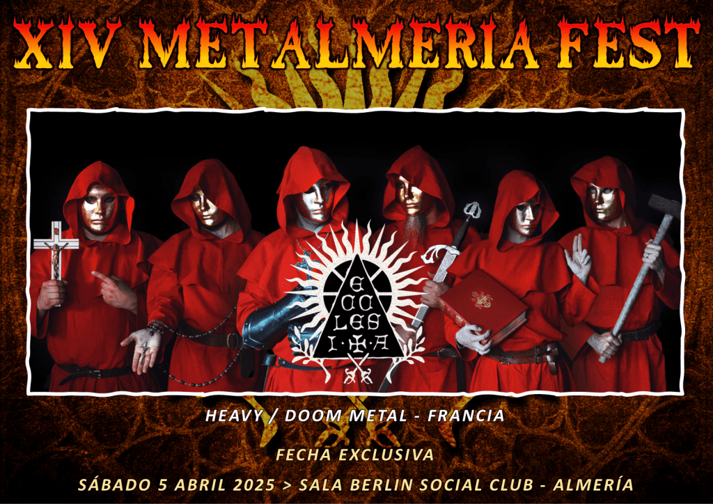 Iniciamos la tanda de confirmaciones para el próximo XIV Metalmeria Fest con los franceses Ecclesia, banda formada en 2016 por Witchfinder General con la intención de volver a poner en el candelero y reivindicar la obra expiatoria de la Santa Inquisición allá por la edad media. Ataviados con el atuendo típico de la época, su puesta en escena no te dejará indiferente. Musicalmente Ecclesia puede catalogarse como Heavy/Doom Metal, con marcadas influencias de Black Sabbath (Tony Martín era), Candlemass, Cathedral… Siendo una de las sensaciones dentro del estilo en los últimos años. Han editado una demo «Witchfinding Metal Doom» (2017) y dos LPs: «De Ecclesiæ Universalis» (2020) y «Ecclesia Militans» (2024) hasta la fecha. Ven a expiar tus pecados el próximo 5 de Abril al XIV Metalmeria Fest, o serás acusado de alta traición a la fe metálica!