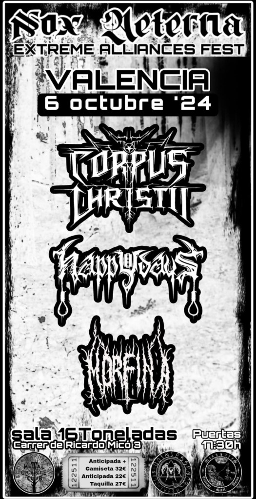 3 comentarios sobre “Crónica NOX AETERNA Valencia: HAPPY DAYS + CORPUS CHRISTII + MORFINA (6.10.24, sala 16Toneladas, Valencia)”