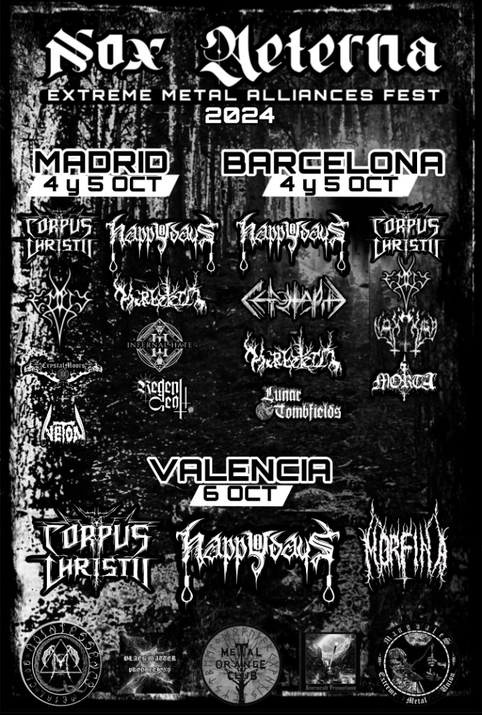 El Nox Aeterna Fest en la Sala 16 Toneladas de Valencia se erigió como un auténtico aquelarre de Black Metal, en el que Metal Orange Club, como anfitrión en esta fecha, cerraba el primer festival colaborativo del género, en el que Quintessence Metal Club y Manguales EMU habían desarrollado en Madrid y Barcelona respectivamente durante el viernes y sábado. La producción fue impecable.
