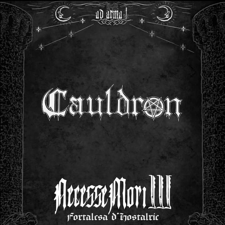 CAULDRON – 30º Aniversario El astro rey se esconde difuminando en el inmenso cielo sus últimos rayos, que ahogados, se diluyen en el firmamento. Es hora, mi querido lector, de que me acompañes en un recorrido diferente, por tierras de poniente. Prístina en el manto oscuro domina ahora la Luna. Lleida, es una tierra que alberga enigmas inquietantes, misterios oscuros de caballeros templarios y cátaros. El Turó de la Seu Vella custodia secretos, violentas persecuciones de brujas, episodios de nigromancia y exorcismos. Lleida tiene de todo esto… y CAULDRON. Fue de las primeras bandas españolas iniciadas en las negras artes y se erige hoy legendaria. Thanatos y Aqueronte debieron descubrir por aquel, ahora lejano, año 1993 su particular Darvaza, la Puerta del Infierno, y no dudaron ni un segundo en plantar el caldero más blasfemo de todos ante los incandescentes vapores del negro Infierno para desatar con total nocturnidad y alevosía su más maléfico, puro y auténtico Black Metal. Tras un par de demos distribuidas, “Rehearsal Tape” (1996), “When The Wheel Has Come Full Circle (old version)” (1998), graban el que es para mí un auténtico trallazo de puro unholy black metal, “Aker” (2001) que tuvo muy buena acogida dentro de la escena underground. Después de un tiempo inactivos, es lo que suele ocurrir con los violentos y explosivos volcanes, volvieron en 2012 para recordarnos a todos que, como el Krakatoa o el Vesubio, se estaba fraguando una nueva erupción en forma del más impío y salvaje black metal y esto tuvo lugar con la publicación del más reciente LP “Regnum-Phobos” (2017). La banda formada actualmente por Thanatos (batería), Crypt (bajo), Kzanhagr (guitarra, Beyond Death’s Throne, Nagyszeben, Necroracle, Arkhaeth, ex Morknatt) y Febo (vocalista, Arkhaeth, ex-Morknatt), se encuentra actualmente dando forma a un nuevo álbum y, coincidiendo con su 30º aniversario, prepararan toda una experiencia desgarradora, una masacre diabólica digna de ser vivida.