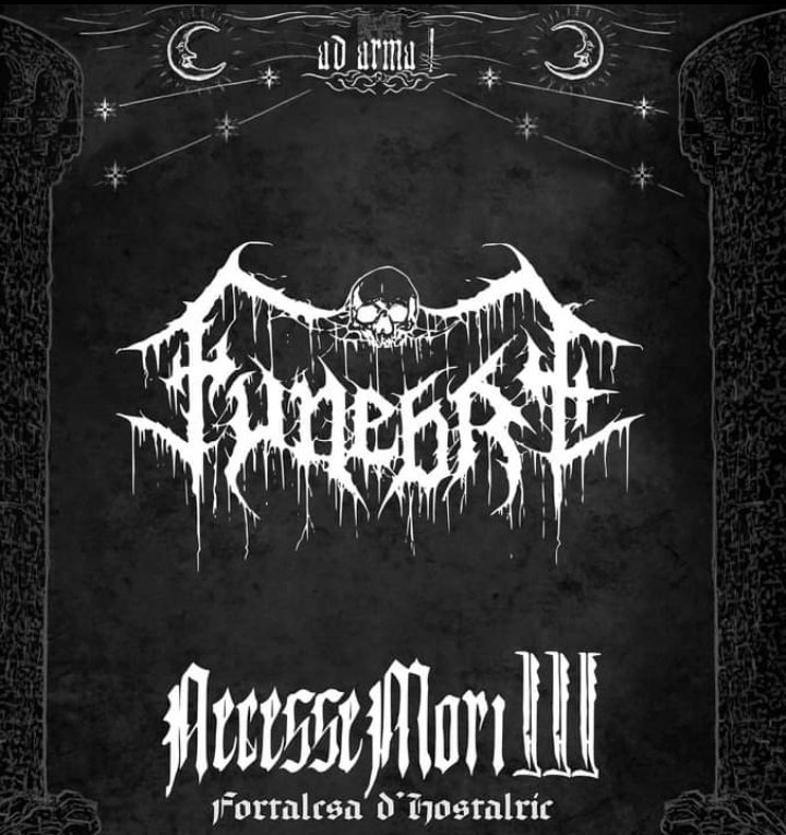 FUNEBRE Desde la tierra de Baetulo, los micacos y los badius, tres infames guerreros, Necroceron (guitarra) Asmodeus (vocalista) y J.Valenciano (batería) de diferentes huestes como Morta, a quienes tuvimos el placer de dejarnos masacrar en vivo en el pasado y espectacular Nox Aeterna, festival organizado por la Triarquía de la Oscuridad, Manguales EMU, Quintessence y Orange Metal Music el pasado 4, 5 y 6 de Octubre en Madrid, Barcelona y Valencia; Guillotina, Nagyszeben, Cauldron o más recientemente Stygian Storm (en donde Hatvast, actual batería desde 2023 y que sustituye a J.Valenciano, ha colaborado en las sesiones de grabación), se reúnen para vomitar con fervoroso ardor las más injuriosas blasfemias en la lengua de Molière. Black Metal crudo, sucio y furioso que bajo el nombre de FUNEBRE dieron forma a dos Demos, “L’ordre compris dans le chaos” (2018) y “Ennemi Éternel” (2019). Esperemos que tras reactivarse la banda en 2023 podamos seguir disfrutando de esta abyecta, putrefacta y vil propuesta, no solo en esta especial ocasión sino también en días venideros.
