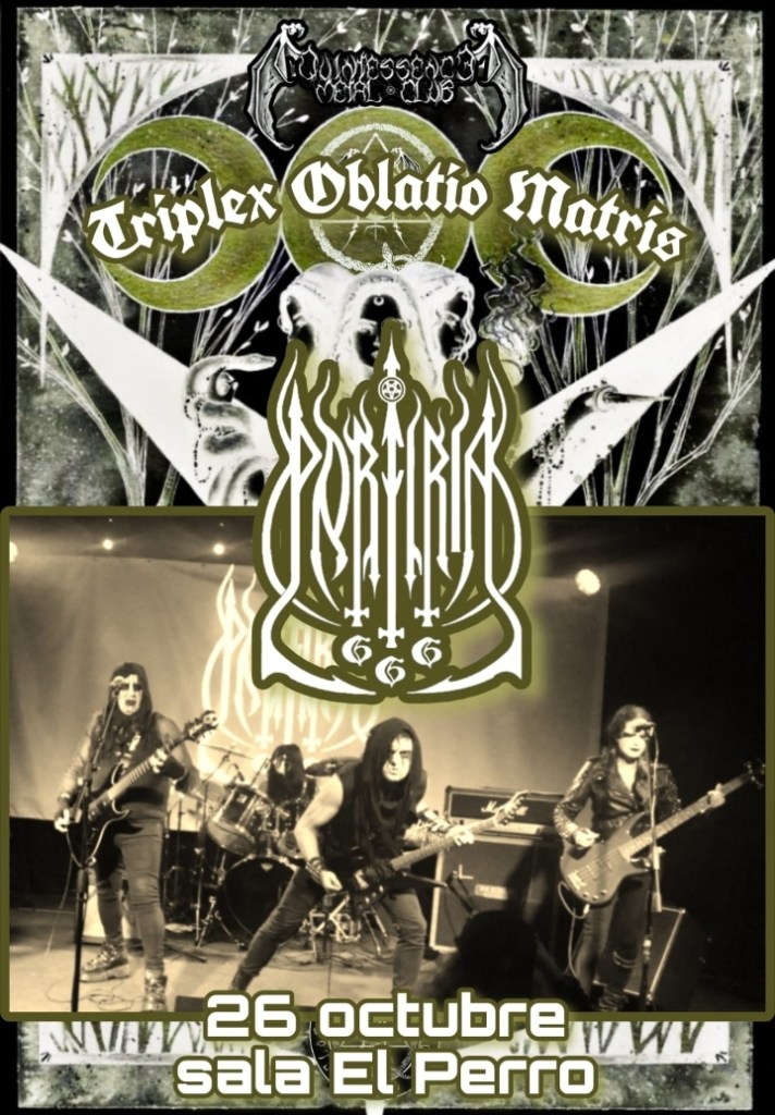 Porfiria 666 Convocada a través de un aquelarre en tierras pucelanas, en una noche lejana de 2006. Porfiria 666 se estableció como una entidad que exhala puro terror y oscuridad por todos los poros de su mas que tangible presencia. Tras numerosos cambios en formación desde entonces.A Amehc (Grima Inc., ex-Durox de Mollera) se le unió Ereni (ex-Hostil) como baterista fija desde 2019. y, mas recientemente, tanto Ahräs (Proyecto Rockin’ Ladies, ex-Elektra, ) como Apnauj “Bloody Beast” (False Faith y Burners) cerraron la formación cubriendo bajo y guitarras principales respectivamente. Una primera demo tan potente como “Opus Tenebricosus” ya les puso en el mapa en 2014, de la cual se extrajo un single, “Marcado por las Tinieblas”, para hacer acto de presencia en la compilación “Potest Solum Unum” editada por Pucela Extrema. Pero la verdadera crudeza vino de la mano del apropiadamente titulado “Tiempo de Invierno”, LP presentado en 2017 y antecedido por el single “Aquelarre”. Numerosas giras, compartiendo tablas con Mistweaver, Nakkiga o Kirkebrann por nombrar algunos, e incluyendo una estelar participación en el Laurus Nobilis donde compartieron tablas con SepticFlesh, Moonspell o Vader, avalan la fuerza y brutalidad que muestran allá donde pisan. Todo esto y más es lo que traerá Porfiria 666 al Triplex Oblatio Matris el 26 de Octubre, puesto se oyen ecos espectrales que afirman que habrá temas nuevos en su primera visita a Madrid.