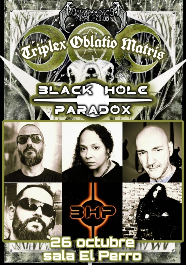 Black Hole Paradox De las fuerzas combinadas de Pablo Alobera a bajo y voces, Rodrigo Hernández a la batería y Andrés Burgoa a guitarras, uniéndose poco después Oriana Riot a las voces, cerrando su formación con Sergio Ramos a guitarras melódicas. Black Hole Paradox se materializó en nuestra dimensión un no tan lejano 2022. Antecedido por singles como “Waiting for my Grave” “Straight to Hell” y “Stabbed in the Back”, su EP “Away from the World” hace gala de una rica fusión de estilos. Colindando entre Death Metal melódico, Metalcore melódico y Groove Metal, en un Melodic Modern Metal que impresiona desde la primera escucha. Letras inspiradas en la naturaleza, la mujer y criaturas de otros mundos pueblan cada uno de los temas en un equilibrio perfecto entre belleza y brutalidad sin concesiones. Tras un estreno en las tablas el 16 de Marzo en la Sala Barracudas de Madrid tan emotivo como intenso, compartiendo tablas con nombres fuertes de la escena local como All in Mind y SouthGate. Proveyendo así una fuerza solida al Triplex Oblatio Matris.