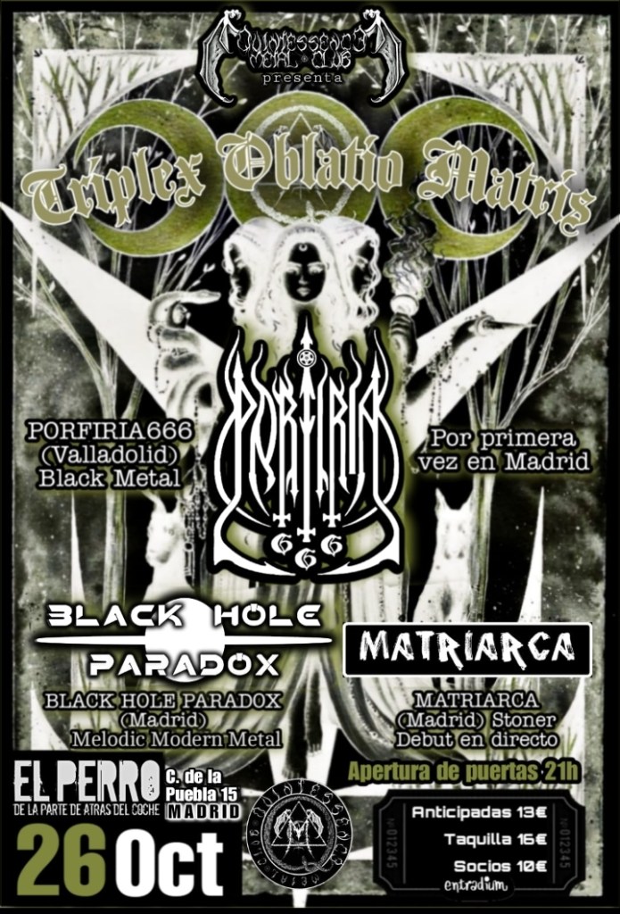 Octubre es un mes cargado de magia y oscuridad. Rituales arcanos celebrados por los Iniciados en las artes de la mano izquierda acontecen en lugares señalados en pos de rendir tributo, y ofrendar buscando el favor de fuerzas que van mas allá de lo tangible y que influyen en nuestro mundo terrenal. Este 26 de Octubre, cerca de Samhain, se celebrará el Triplex Oblatio Matris. Un aquelarre audial en colaboración con Quintessence Metal Club, en la que 3 poderosas bandas desatarán toda su energía y buen hacer en la sala El Perro de la Parte de Atrás del Coche, en el corazón de Madrid.