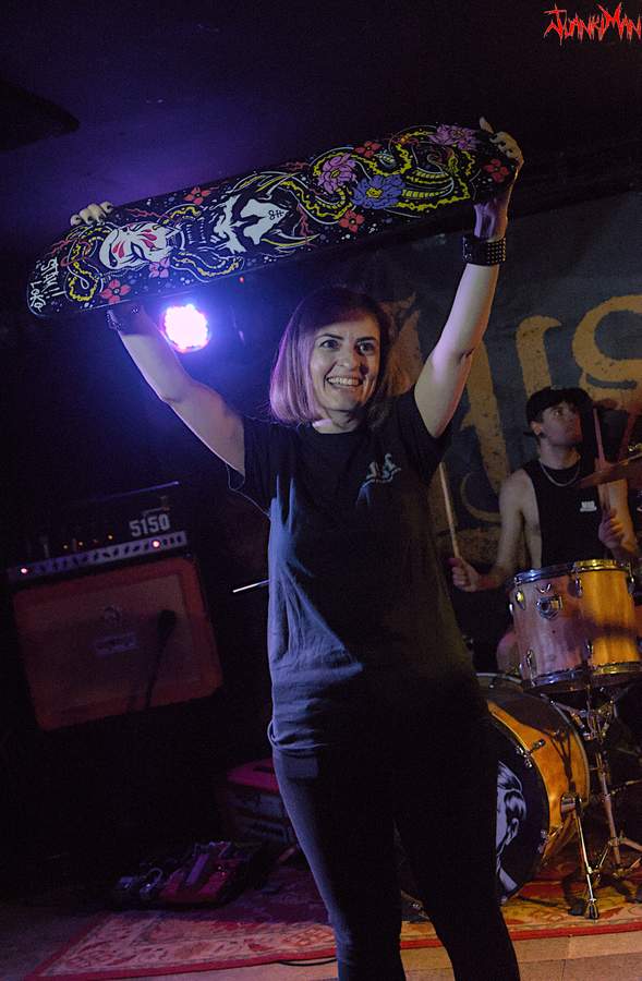 “Traitors” y la noche se llenaba de sudor. Primeras filas desmelenadas. LUST movían ficha con “Children Of War”, nuevo tema y no sería el único. Vítores por este single acompañados por una vocalista que no daba tregua, “Isolation”, “Live To See” marcados por ese hardcore feroz y contundente. “Éxodo” y llegaba uno de los momentazos. El cover de la banda angelina de hardcore punk Terror y el tema “Overcome” de sus inicios, hicieron delirios entre los allí congregados. Uno de los temas más personales y nuevo llamado “Ansiedad” llevaba la marca hardcore tatuada. La noche había avanzado más de lo que quisiéramos y todo llegaba a su fin. Pero todavía quedaba el sorteo que nos habían anunciado en RRSS los organizadores FeTTeM Clothing. Una tabla de Skate, con diseño de Fanone (Ivan) y que llego a las manos de mi amiga Laura (Parte también junto a Alex, creador de AGENDA METAL MADRID).