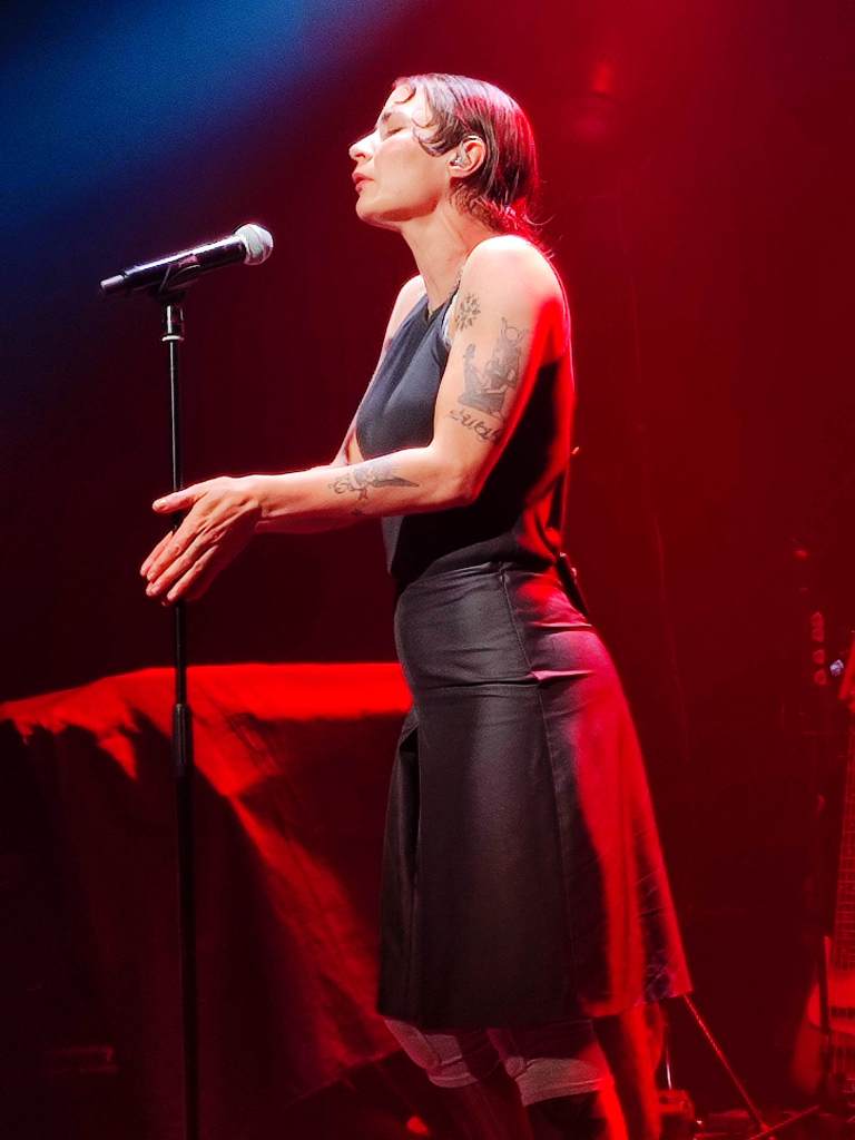 Pero antes de la ceremonia de la Wolfe tuvimos una buena sesión de perfomance gimnástica musical a cargo de la también norteamericana MARY JANE DUMPHE, una artista de avant garde corporal y expresividad teatral que pareció no encontrarse muy cómoda en el escenario, en parte también porque no se lo pusieron fácil. Pidió más oscuridad en las luces, cambios en el sonido, e incluso pidió una botella de agua, y ni eso le dieron, terminando la actuación un tanto ofuscada y sedienta, lo cual influyó notablemente en el resultado final. Buena voz, alguna canción con guitarra acústica, y bases pregrabadas para una música sincera y emocional a medio caballo entre el minimal pop y el country, un cocktail que resultó quizá muy desequilibrado y que no termino de contactar con una sala ya llena a reventar desde el principio.