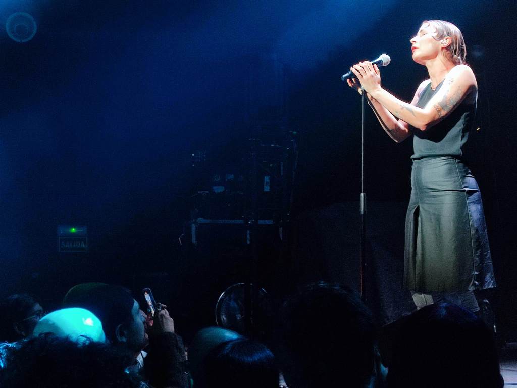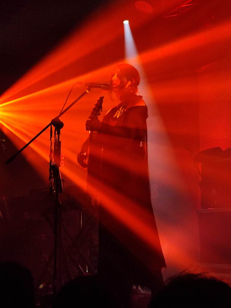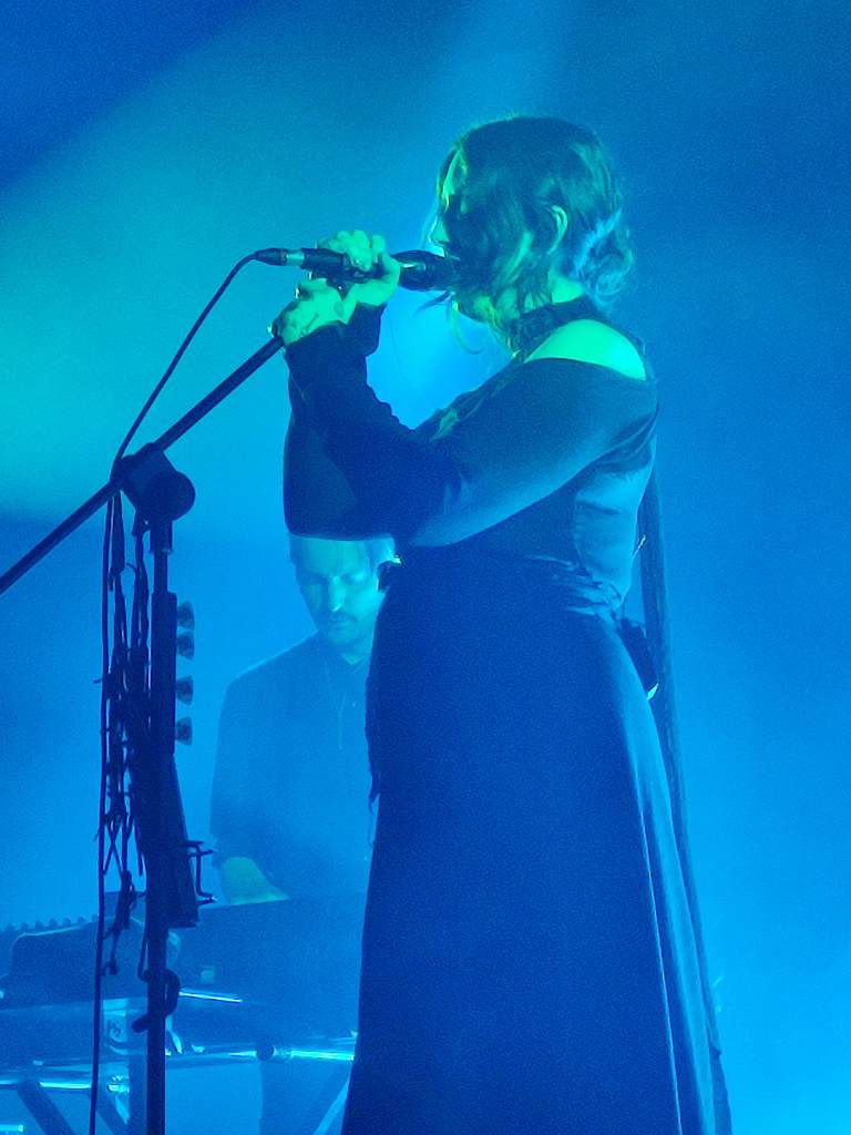 Lo primero que voy a subrayar de la aparición mariana que fue ver a CHELSEA WOLFE en el concierto es el impresionante juego de luces. La base del ambiente sobre el escenario es la sugerente oscuridad, desvelando siluetas ensoñadoras, ocultando tanto como enseñando, ofreciendo perfiles de claroscuros y resaltando la ya de por si fantasmal presencia de la diva. La colocación de los tenues focos de luz fueron muy sencillos pero tremendamente efectivos, por encima, a los lados, pero a la misma altura del rostro de los músicos, por detrás también, realzando ese outfit de institutriz decimonónica de la cantante. Junto a la aparición de humo en el escenario, este parecía un espacio entre la vida y la muerte, un Hades personal en el que Chelsea se encuentra muy a gusto. Su voz, tímida, quebrada, acompañaba sus suaves movimientos, construyendo una presencia de otro mundo, un ánima casi irreal, una artista de otro tiempo y de todos los tiempos a la vez.