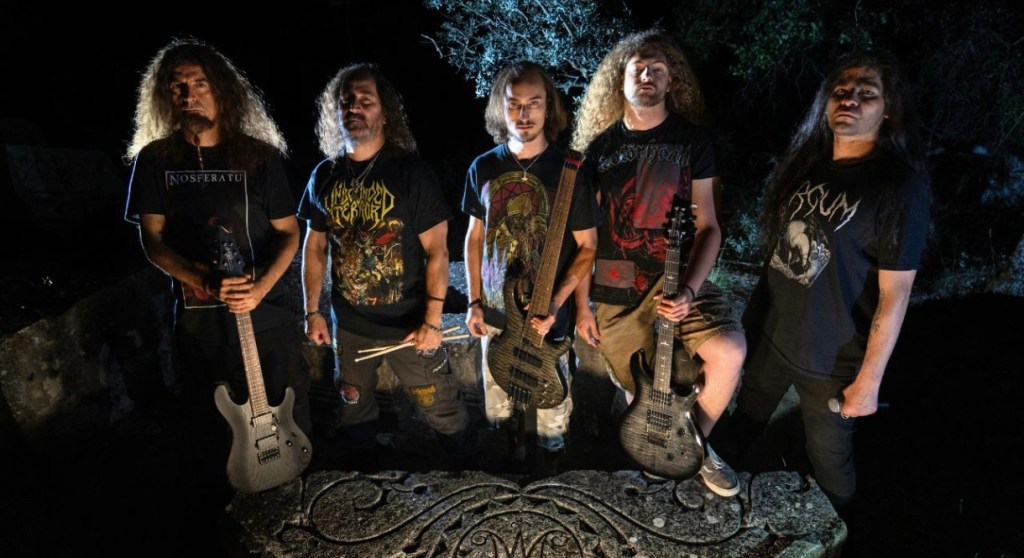 CEREBRAL VORTEX: Muy buenas Cesitar… lo primero gracias por ponerte en contacto con las bandas y tomarte la molestia de acercarnos, a través de esta entrevista, un poco más a la peña. David a la batería ( «Tripas» ) y yo (Miguel a la guitarra) coincidimos por un amigo común un par de años antes de la pandemia. Empezamos tocando versiones de Death, Pungent Stench, Terrorizer etc…para pasar el rato y divertirnos ; pero la conexión fue muy buena. Yo tenía viejos riffs y estructuras de guitarra compuestas y nos pusimos a darles forma. Así surge «All flesh Must Be Devoured» que fue el primer tema que compusimos. A la par empezamos a buscar componentes para cerrar la formación y tirar para adelante como banda sin más pretensión que cerrar temas y poderlos tocar en directo. Después de idas y venidas Pablo al bajo, Jamie (ex-Mordhida) a la otra guitarra (que empezó para echarnos una mano en la grabación en el estudio y sigue con nosotros como miembro permanente) y Luis » Gambito» (ex-Oxicorte) a la voz terminan cerrando la formación actual.