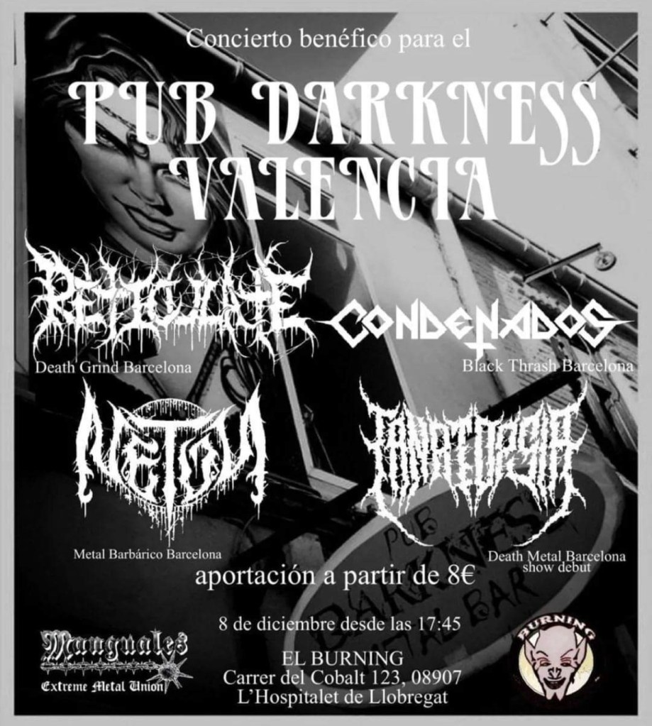 RETICULATE: Como te contaba antes, el destino ha querido que tocáramos en el pub Darkness justo hace unas semanas, poco antes de la catástrofe. Nos dolió especialmente porque la fecha la recordamos con cariño, allí tocamos con Vaginal Kebap, Futanari, Slamentable, y Fractura de Pene, y todo transcurrió de una manera muy festiva y divertida. Actualmente, gracias a la idea de Lena, la mujer de nuestro guitarrista, nos reunimos con la promotora Manguales, y gracias al bar Burning, el próximo 8 de diciembre participaremos en un concierto con 3 bandas más, cuya recaudación irá destinada a ayudar a la recuperación del club Darkness, aprovecho el espacio para invitar a los lectores y a que visiten nuestras redes para más información.