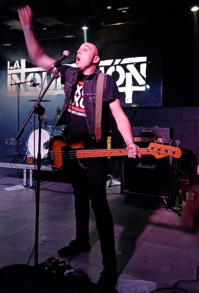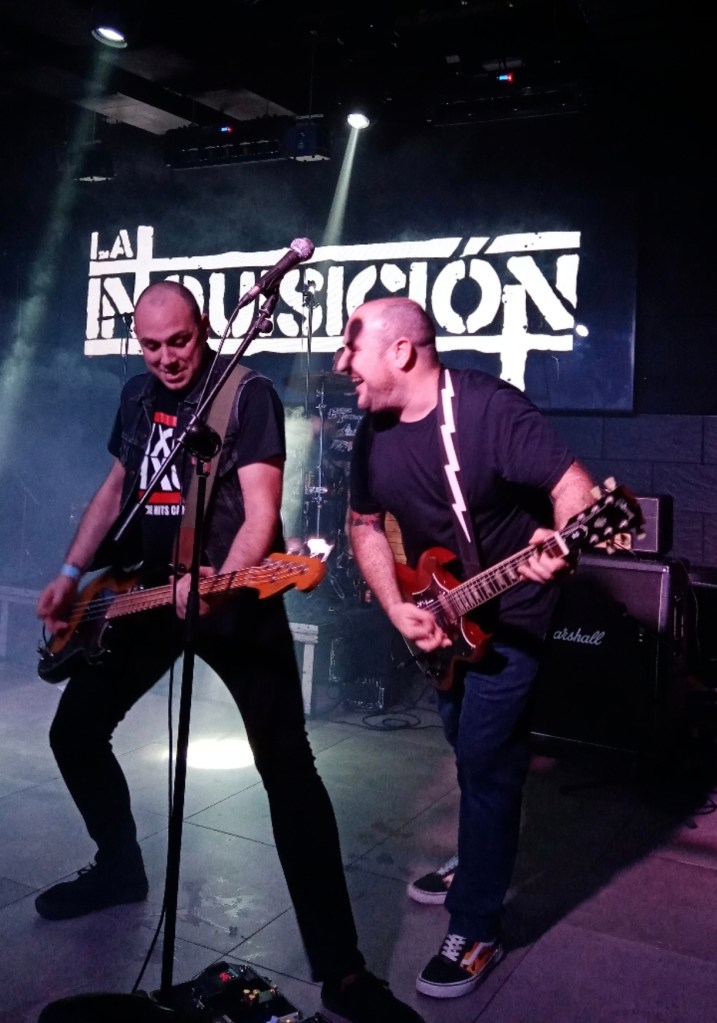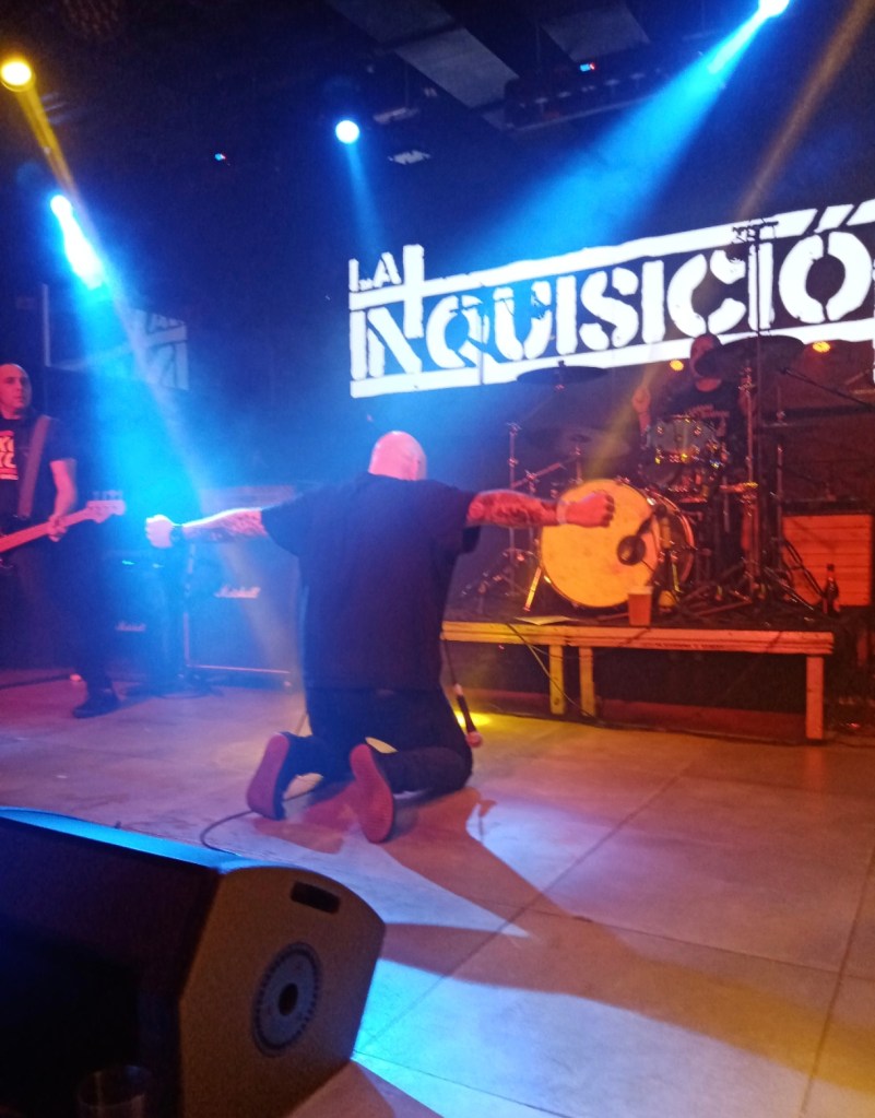 Cambio rápido de escenario y puntuales a las 21 h salen VENTURA LA MUERTE. Banda madrileña de punk rock, con una dilatada experiencia. Comienzan con una frase algo así como «Los que se aferran a la vida mueren, los que desafían a la muerte sobreviven». Sólo había escuchado algo de ellos antes del concierto y no pintaba mal. El sonido un pelín alto, para mí, y con algún problema con el cable de la guitarra, salieron con bastante energía al escenario, provocando los primeros empujones en las primeras filas. Set list un tanto corto, sólo tocaron 35 minutos y aun así, creo que se dejaron «Retorno» en el tintero. Reconocí «La playa», que la pidieron al segundo tema, a lo que Ángel, el bajista, contestó «¿Ya?», pero esperaron hasta el final para tocarla. El público se volcó con ellos, coreando los temas, formando pogos… Dejando paso a los cabezas de cartel, La Inquisición.