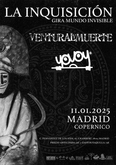 Empezábamos fuertes el año. Viernes una cita, sábado otra, ¿domingo…? No, no, no, la edad ya se nota y hay que guardar fuerzas para todo lo que viene este año. Pues eso, el sábado, después de la primera asamblea general de Quintessence Metal Club, del cual REA es más que el medio oficial, a las 20 h, en la Sala Copérnico tenía lugar el auto de fe con La Inquisición, YovoY y Ventura La Muerte.