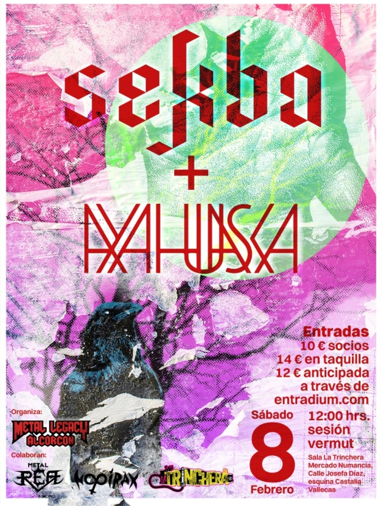 El próximo sábado 8 de Febrero, la Asociación Metal Legacy Alcorcón, organiza concierto en la vallekana sala “La Trinchera” a partir de las 12:00 h. El ya conocido como “horario vermuth” es un tramo horario que cada vez va ganando más y más aceptación. El concierto en cuestión, es de dos proyectos que se mueven en el terreno de la investigación sónica, en el espacio del Post Metal y el Post Rock. Las bandas que se subirán al escenario en esta ocasión serán los madrileños Sekba y Ayahuasca.