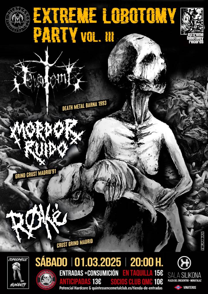 Por tercer año consecutivo en Madrid, llega el EXTREME LOBOTOMY PARTY Vol.III, cita ineludible para los amantes del extremo más cafre, salvaje y reivindicativo. Siempre con carteles interesantes y valientes, que en esta ocasión cuenta con los locales Rokë, los anfitriones Mordor Ruido y creadores del festival; y los catalanes Teratoma, por primera vez en la capital. Una sesión triple de Crust, Death y Grind capaz de hacerte perder la sesera el próximo 1 de marzo en la Sala Silikona. No pude dejar pasar la ocasión de hacer entrevista «a 3 bandas», porque del bruterío, me fío!!