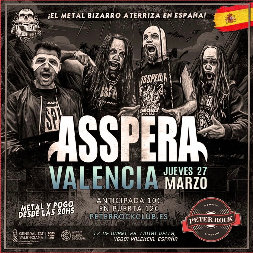 ¡¡Una noche de pogo, bizarrez y metal del bueno!! El sábado pasado, los muchachos de Asspera la rompieron toda en la Sala Peter Rock de Valencia, en lo que fue un recital más íntimo que los que suelen meter en Argentina, pero con una energía que explotó desde el arranque. El público, en su gran mayoría argento, también había un par de uruguayos — que en ese contexto también jugaban de local — y algunos españoles colgadísimos, como uno que se ganó el respeto de todos con una camiseta del mismísimo Bananero, ídolo espiritual de la banda si los hay.