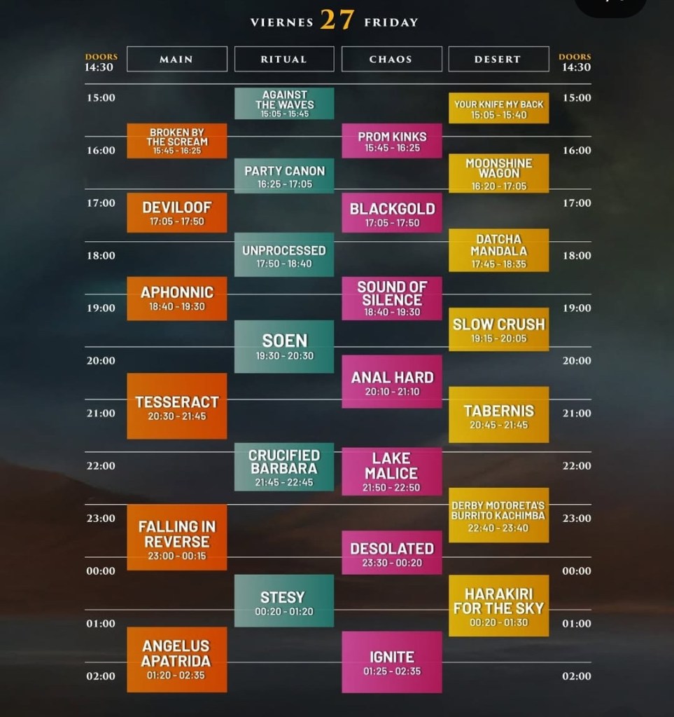 Mencionamos a Soen (Ritual 19.30h) y me paro en Desolated (23.20h en el Chaos). «Es que el espíritu con el que nació el Resu hace 20 años, es el espíritu que rodea al Chaos Stage». Coinciden con Falling in Reverse, pero después de haber visto los vídeos de Desolated yo voy a estar en el Chaos, caiga quien caiga.