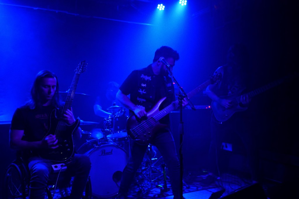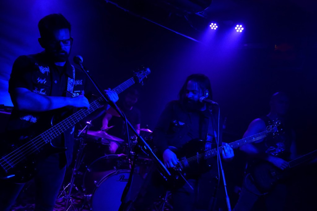 Y es que el cuarteto establecido por A.M., S.D., D.U., y J.H. entró como un absoluto maelstrom. Arrasando con toda esperanza, absorbiendo toda luz posible. Sobre un escenario apropiadamente situado en los previamente mencionados bajos de la Starving. Iluminado por tonos fríos como bien podéis comprobar en las imágenes (¡¡gracias Juanma!!) que humildemente acompañan la chapa de este caballero de triste figura. El setlist elegido siguió con “Prison of Shattered Glass”, siguiente tema del EP cuyo titulo comparte el tema que sirvió de apertura. Derivando a partir de ahí a temas de “Behold the Silent Dwellers”. Su último LP hasta la fecha ya que, a modo sorpresa y perfectamente encajados, como si del propio ojo del huracán se tratase, pudimos experimentar de primera mano la intensidad de 2 temas completamente inéditos que cayeron íntegramente y que, personalmente sospecho, pueden ser el adelanto de otra tempestad por venir. Contando con todo, podemos decir sobradamente que la tormenta perfecta se desató sin mas, sin amainar en cuanto a cadencia y potencia bajo ningún concepto.