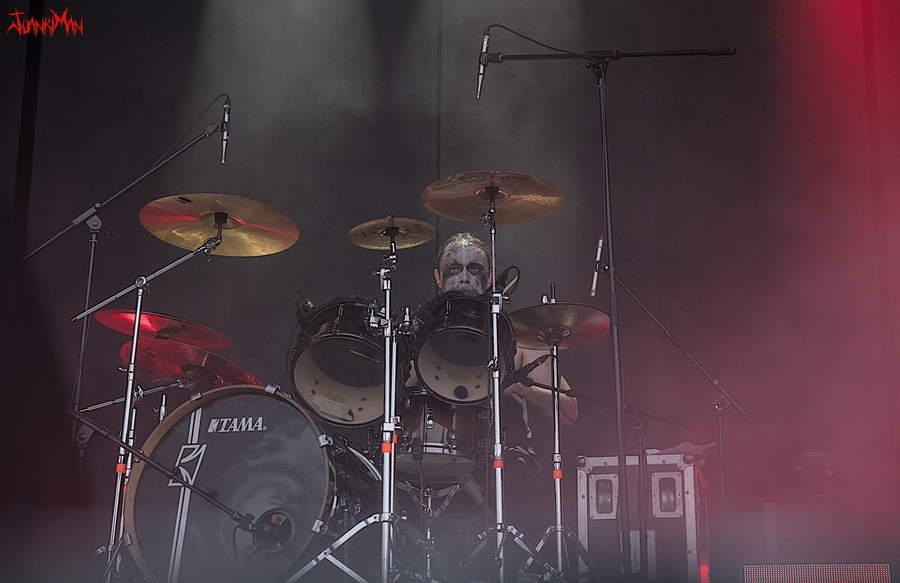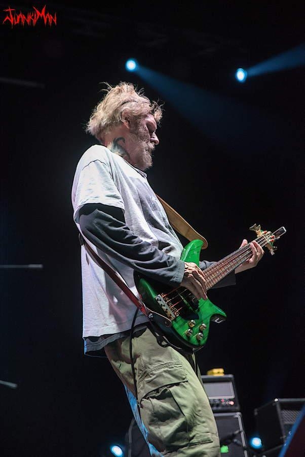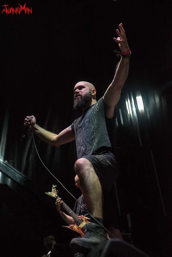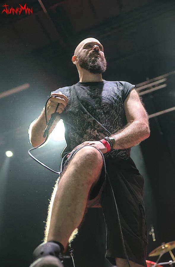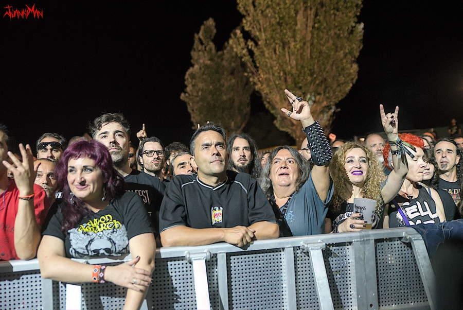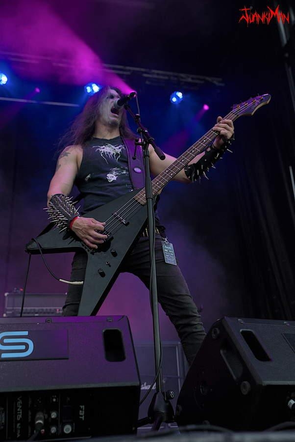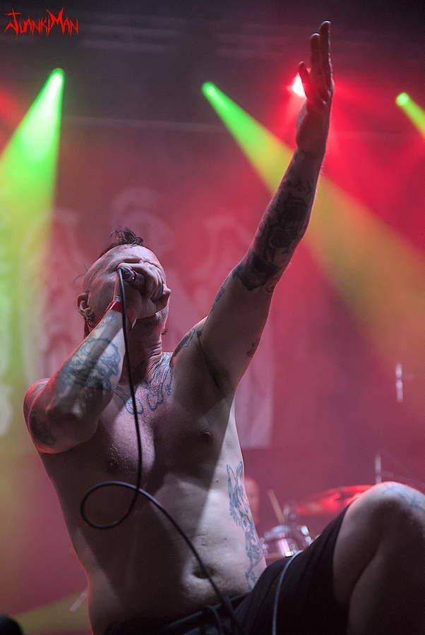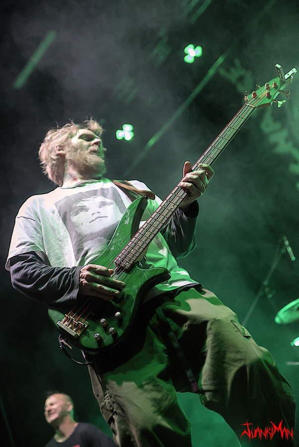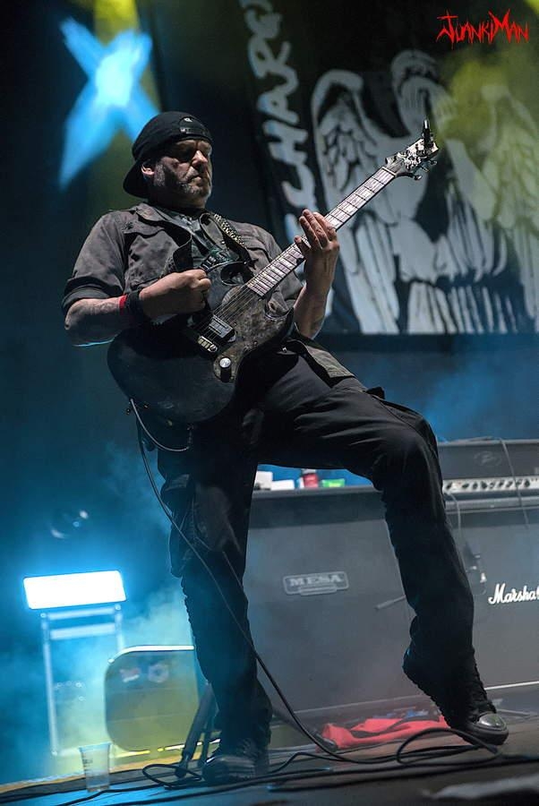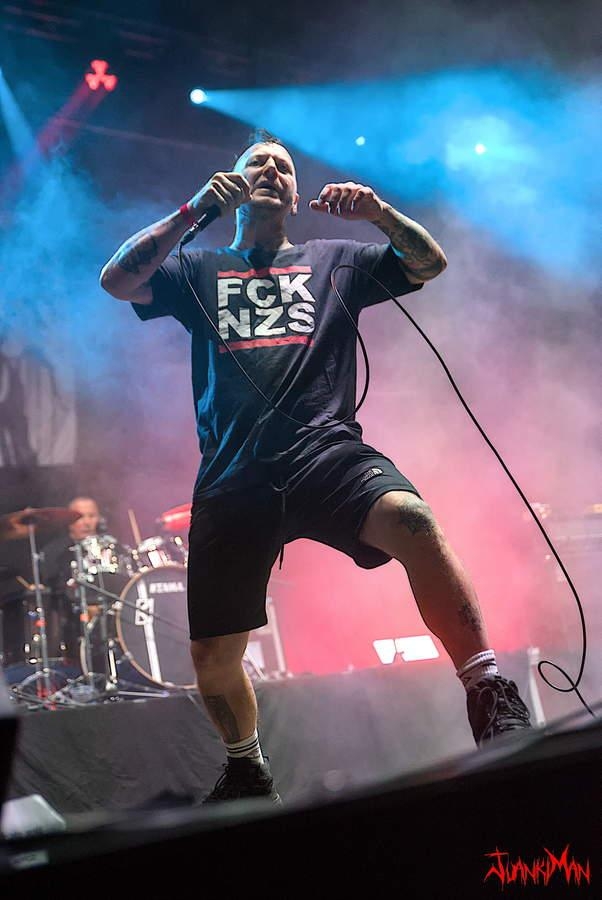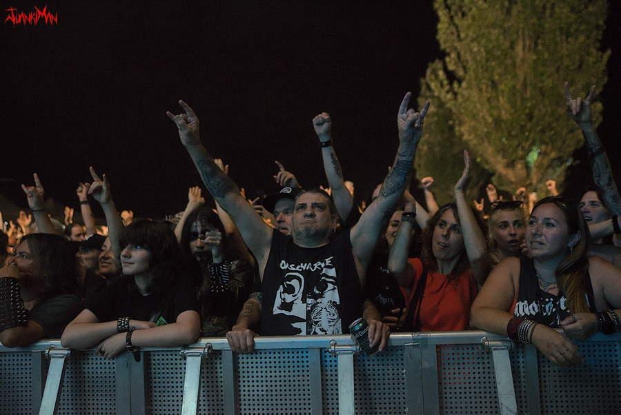 Los siguientes en la lista de aparición son la banda más longeva de esta edición, DISCHARGE. Su Hardcore/Punk con tintes de Metal es legendario y ha influenciado a múltiples bandas. Llegaban en plena forma, sembrando la locura en toda la parroquia. Un JJ Janiak pletórico no paró un solo momento quieto. Tampoco la gente permaneció impasible. Continuos pogos y asaltos al foso que la organización canalizaba recogiendo a cuantos aparecían volando sobre las cabezas del KANEKAS. No fueron pocos. Todo con un ambiente festivo y divertido. Se podían ver mezclados entre el público, melenas al viento, crestas imposibles, disfraces… Todo el mundo disfrutaba en armonía al frenético ritmo que marcaba DISCHARGE.