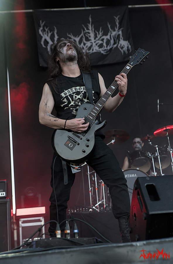 Más se caldeó el ambiente cuando NARBELETH pisó la tarima. La banda que lidera el inefable Drakh, escoltado por sus ya habituales escuderos Marcelo (Vindok) y Alex (King Abraxas), respectivamente, a las baquetas y a la guitarra. NARBELETH no defraudan. Continuaron la línea ascendente de “caña” de esta primera jornada, presentando lo último, de lo último, de su producción discográfica, “A Pale Crown”. Una actuación que a mí, personalmente, me gustó mucho. Bueno, la verdad es que nunca me han dejado con mal sabor de boca y especialmente me agrada el gusto con el que suena su guitarra. Muy sólidos se deshacen en frases de agradecimiento a la organización y a un festival que ha contado con ellos como banda de la tierra que son y que ha demostrado una calidad, una robustez y una cohesión impresionantes. Eso se nota cuando salen al escenario y el público lo percibe. Excelente segundo “round” de la noche, pero aún hay más. Mucho más.