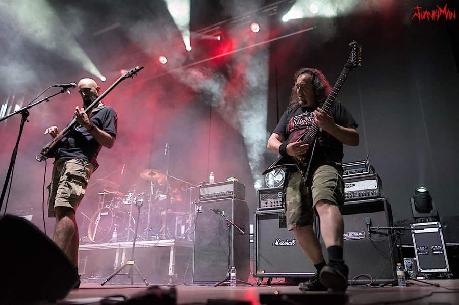 Si de formación veterana y legendaria hablábamos antes, seguimos en la misma línea con los siguientes visitantes del KANEKAS. Hablo de los mismísimos CORONER. La puesta en escena y el estilo son muy diferentes. Si la agitación y el salvajismo de las guitarras son la marca de la casa para DISCHARGE, CORONER son más estáticos, sobrios en sus formas. Su estilo es más técnico, abstracto y complejo. Desde sus letras a sus desarrollos guitarrísticos te envuelven y capturan. Miles de cabezas agitándose al ritmo que marca CORONER no pueden estar equivocados. La inercia que había generado la anterior actuación siguió y los pogos se sucedían, mientras otra parte de la audiencia contemplaba con los ojos y oídos bien abiertos para no perderse un solo compás que saliera de los instrumentos o la particular voz de Ron Royce.