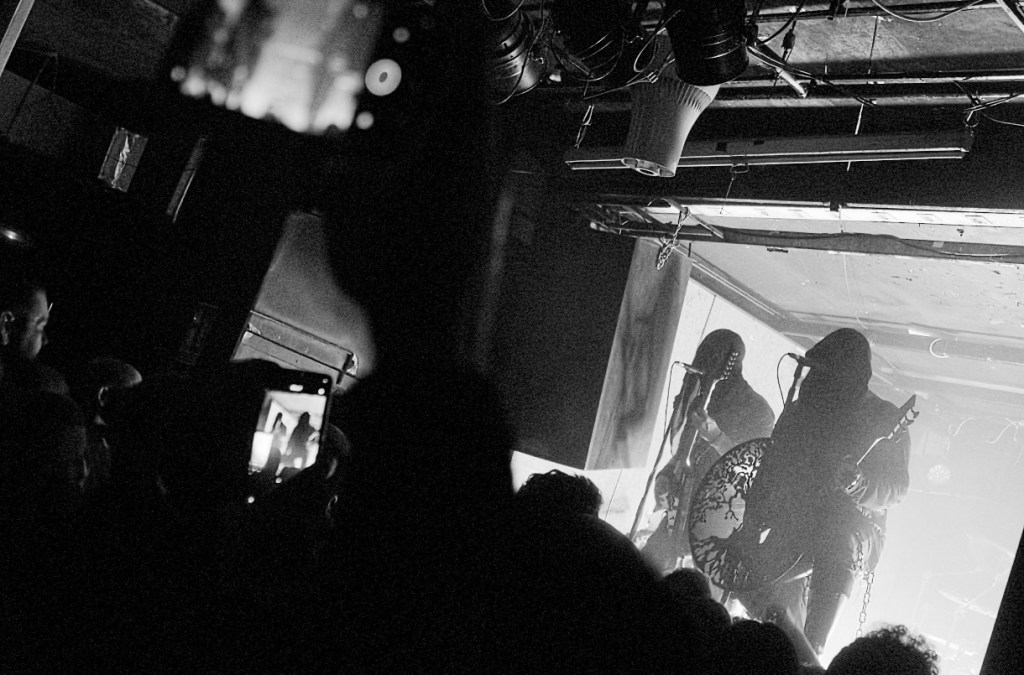 Aún quedaba el plato final de la gran degustación de la que fuimos participes, Groza. El escenario fue reclamado íntegramente por P.G., U.A., T.H.Z., y S.R., quienes usando sus mismas iniciales y tapando sus rostros completamente bajo velos negros, en pleno tributo (y no copia, como algún listillo de turno dijo aún en el recinto) a Mgła. Sumando a toda la Gruta77 en una atmósfera que absorbió a los presentes en un trance absoluto. Tal fue la carta de presentación de una actuación que fue, sin más, un despliegue máximo de aura, una inmersión en la más profunda oscuridad que alcanzó cotas de misticismo. La mecánica usada a priori podría parecer sencilla e incluso predecible tal y como destacó S. No obstante, la sucesión de pasajes ambientales que a su vez acababan en un estallido de blast beast sin concesión alguna era la formula a partir de la cual Groza construyo su etérea fortaleza.